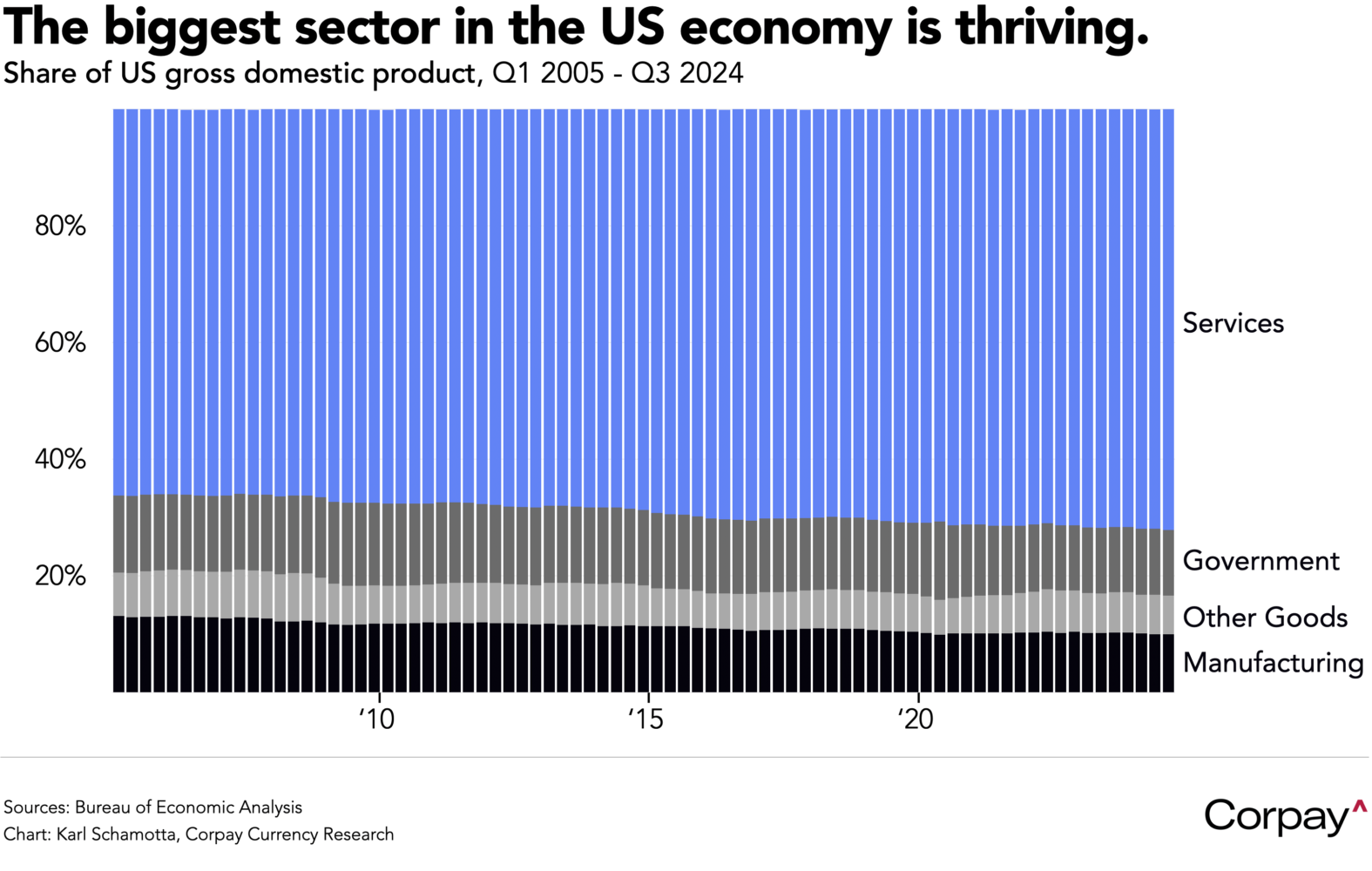 The Institute for Supply Management’s gauge of non-manufacturing activity is seen accelerating in December, helping maintain market confidence in the exceptionalism of the US economy. The services sector, which dwarfs manufacturing as the biggest contributor to overall growth, has remained in strongly expansionary territory for much of the last two years, more than offsetting a post-pandemic normalisation in tangible goods-related industries, and (arguably) limiting the utility of normal business cycle indicators in assessing the strength of the broader economy.