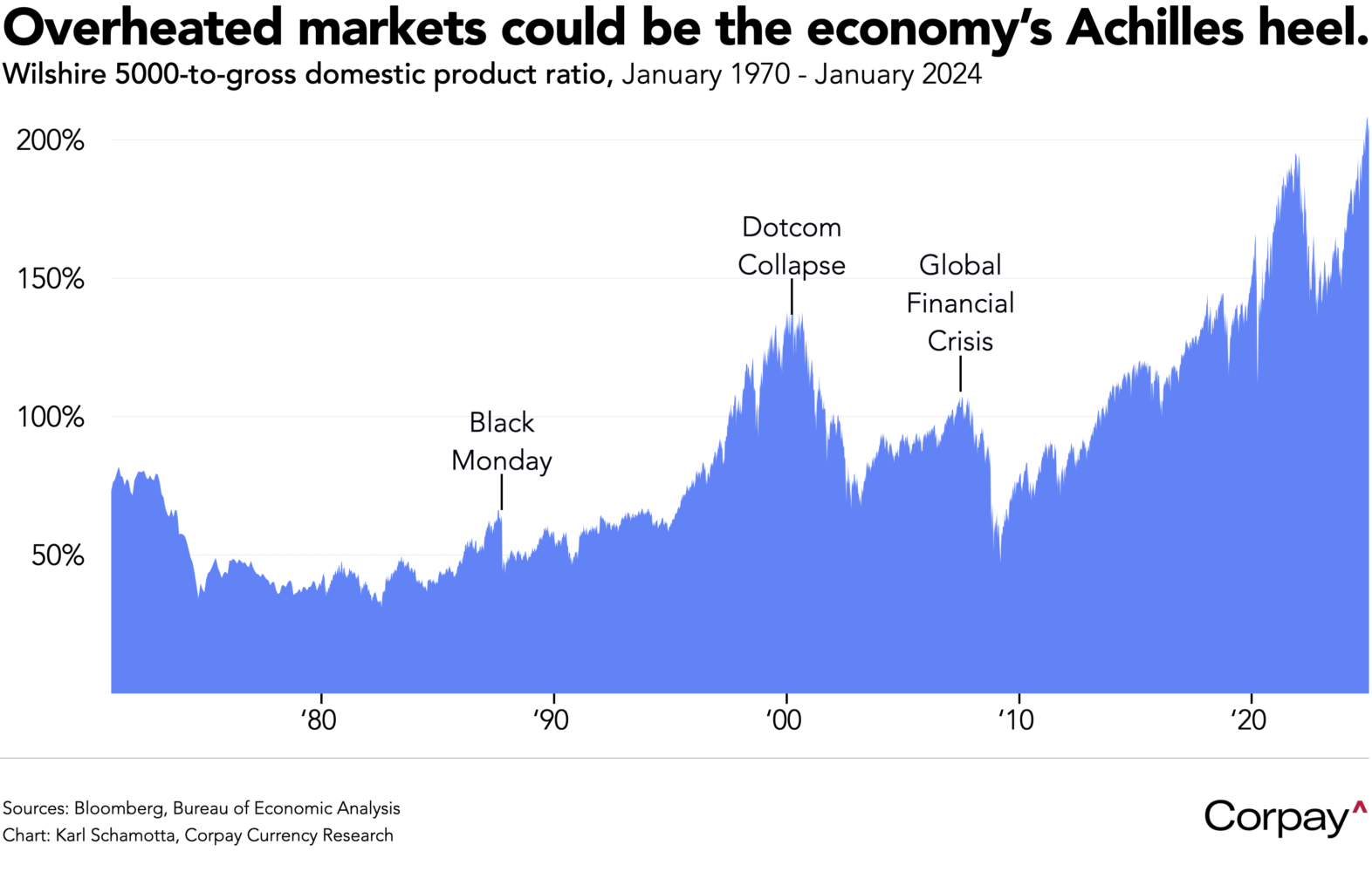 **Yes, we’re aware that this measure compares a stock (market capitalisation) with a flow (gross domestic product), but it nonetheless captures a basic relationship between financial asset valuations and overall output.