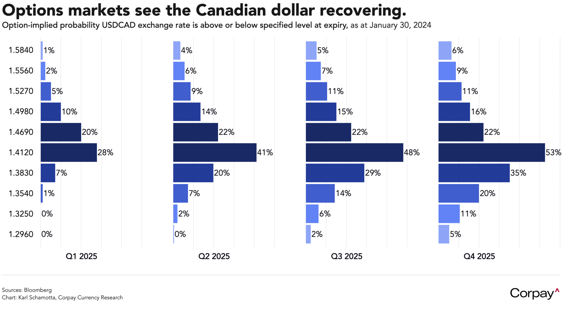 Against this backdrop, we think corporate hedgers would be wise to consider putting tail risk protection on—using option-based collars, for example—and working to communicate this strategy internally, so that a potentially-dangerous overreaction to alarming news headlines is avoided. Note that options markets, which function more like coolly-rational insurance companies than hot-blooded sports-betting syndicates, are bracing for a short period of turbulence followed by gradual Canadian dollar gains this year.