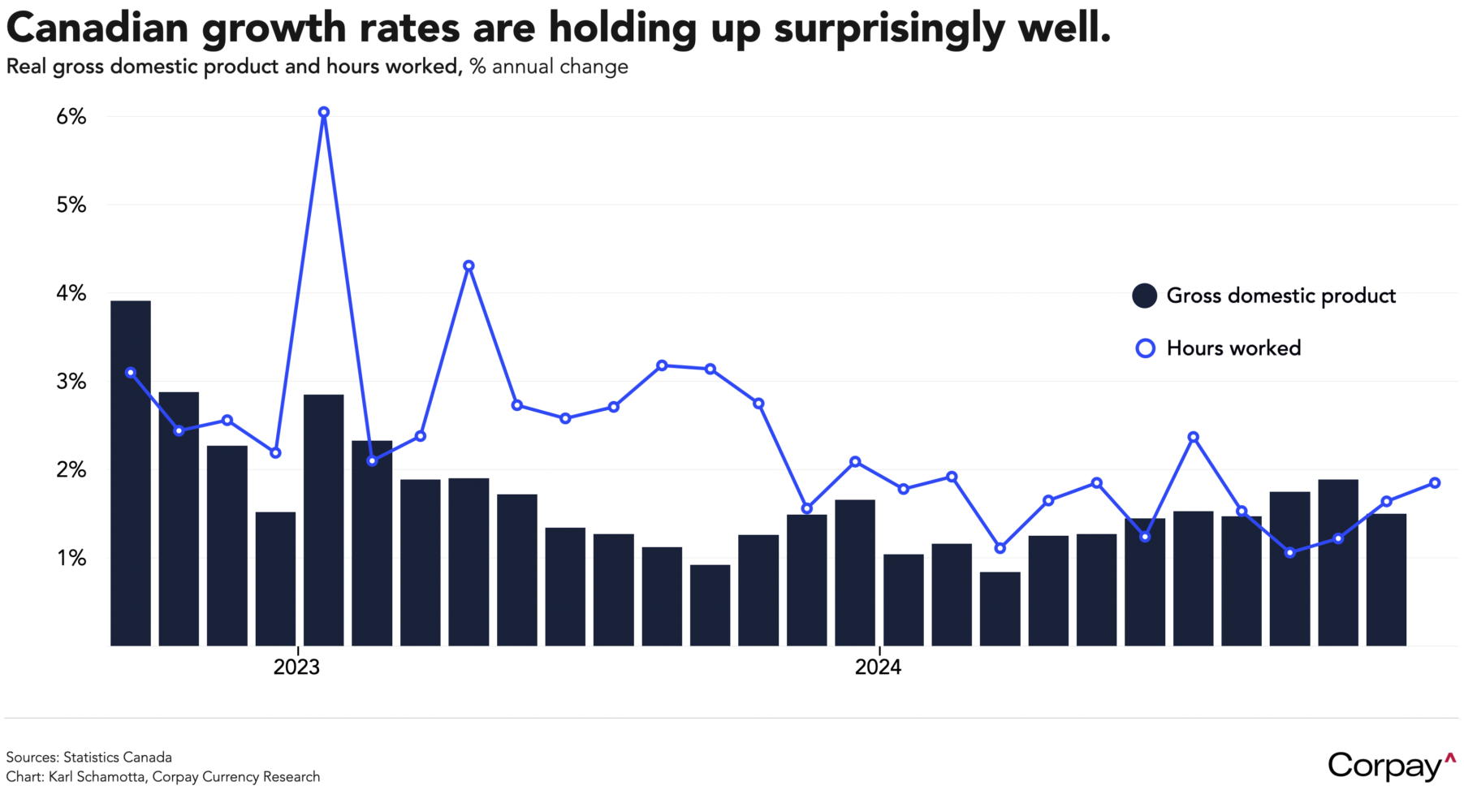 Here in Canada, the economy gained momentum at the end of last year. According to data just released by Statistics Canada, the economy suffered its deepest contraction since December 2023 in November—shrinking by -0.2 percent against expectations for a -0.1 percent loss—but an advance estimate pointed to a modest 0.2-percent rebound in the following month as growth in retail spending, manufacturing and construction industries helped lift quarterly annualised growth estimates toward the 1.8-percent mark. Taken in combination with previously-released gross domestic data and yesterday’s numbers on hours worked, it appears as if the Bank of Canada’s easing efforts are translating into a modest recovery in the economy—something that should, in theory, help narrow rate differentials in the Canadian dollar’s favour.
