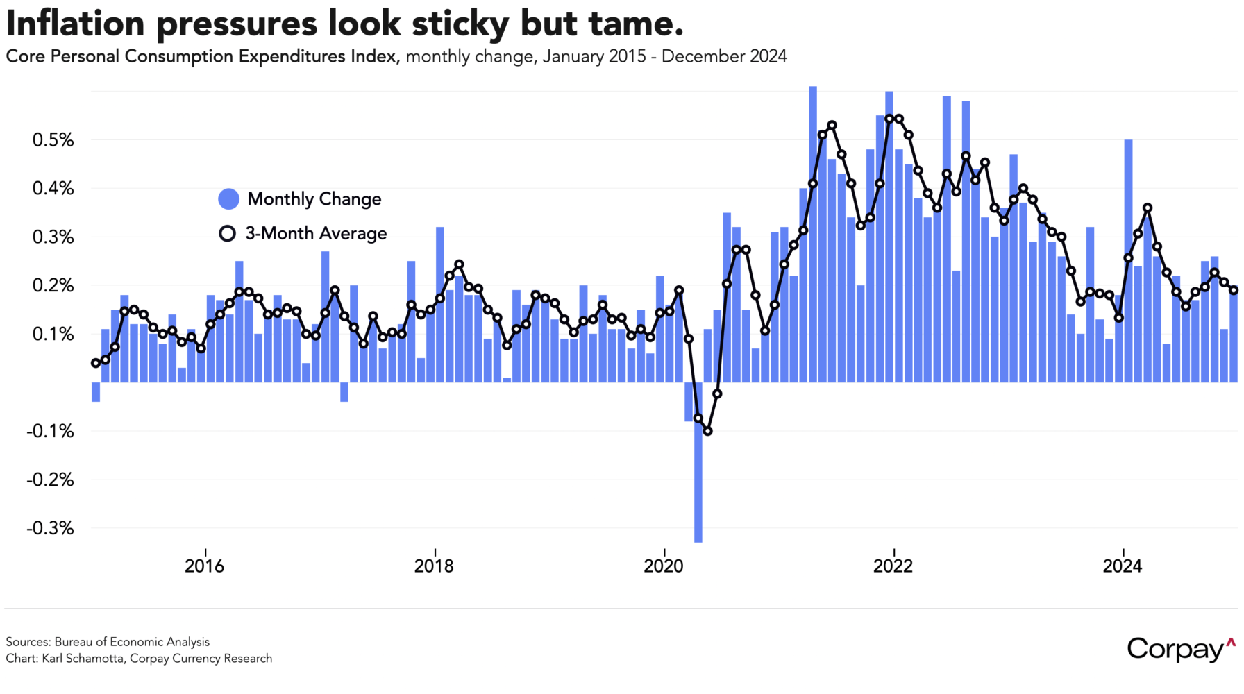 Inflation pressures in the US remained stable at the end of last year. Data released by the Bureau of Economic Analysis this morning showed the core personal consumption expenditures index rising 0.2 percent from the prior month in December, and matching market forecasts. On a year-over-year basis, core prices were up 2.8 percent. The overall personal consumption expenditures index rose 0.3 percent relative to the prior month, rising 2.6 percent from a year ago. Personal income rose 0.4 percent month-over-month, and inflation-adjusted household spending climbed 0.4 percent, suggesting that consumer fundamentals remained strong. According to a separate release, the Federal Reserve’s favoured measure of wage gains—the Employment Cost Index—climbed 3.8 percent in year-over-year terms in the final quarter of 2024, marking the slowest pace in three years.