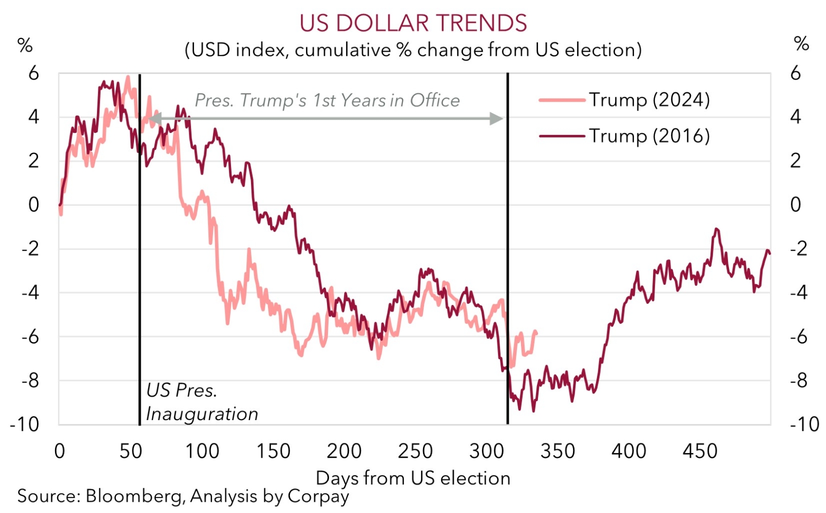 There are a lot of moving parts, and more news/headline driven volatility is likely over the period ahead. President Trump holds his State of the Union address this week (Weds 1pm AEDT). In the short run, the USD may remain on the backfoot, however, longer-term, we think the reworking of the US’ tariff policies could end up giving the USD a boost. (1) The Supreme Court decision shows checks and balances remain in place. This might ease global investors’ worries about allocating funds to the US. (2) Concerns about US growth due to the higher import duties, and what this means for jobs, has weighed on the USD over the last year because it opened the door to more US Fed rate cuts. This drag might lessen going forward (or reverse course if tariff refunds are paid out), and it may mean the US fiscal impulse because of tax cut extensions etc is larger. This, and a snapback following the US government shutdown, points to potentially stronger US growth, which would be helpful for jobs, limiting the US Fed’s ability to lower rates much more. Interestingly, a levelling off and recovery in the USD (which is tracking below our ‘fair value’ model) also started to happen around this point in President Trump’s first term (see second chart below).