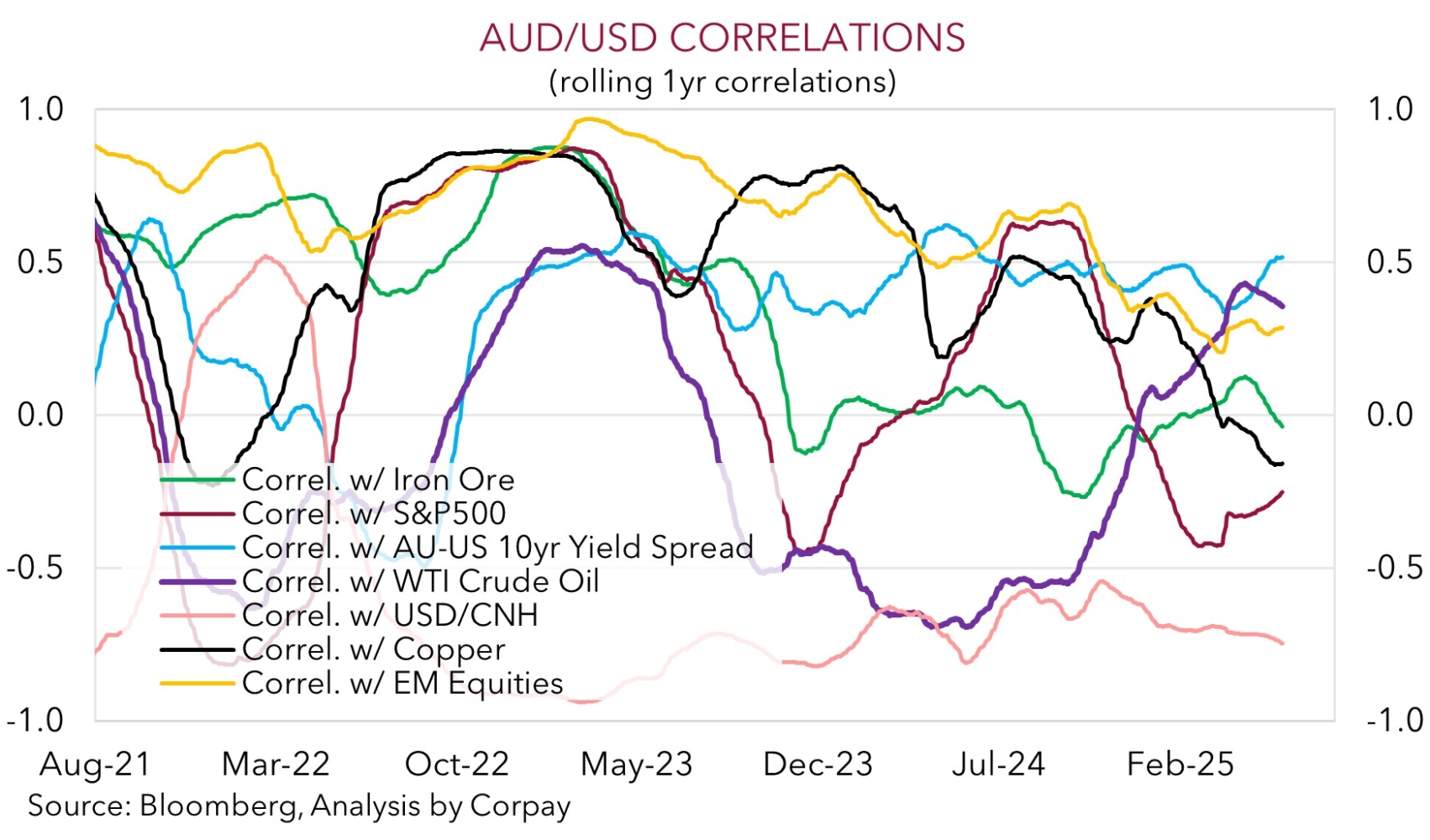 As discussed above, despite the negative headlines outside of the oil price spike the net moves in other major asset markets have been rather restrained. Indeed, as our chart above illustrates the intra-day ranges in the AUD and NZD on Friday were broadly inline with their respective long-run averages. It should be remembered that cyclical currencies such as the AUD and NZD are inherently volatile and are sensitive to swings in risk sentiment/global geopolitical events (see our AUD correlation chart below). However, this may have been somewhat forgotten given the AUD has only traded above its long-run average daily range ~1/3 of the time in the past 2-years.