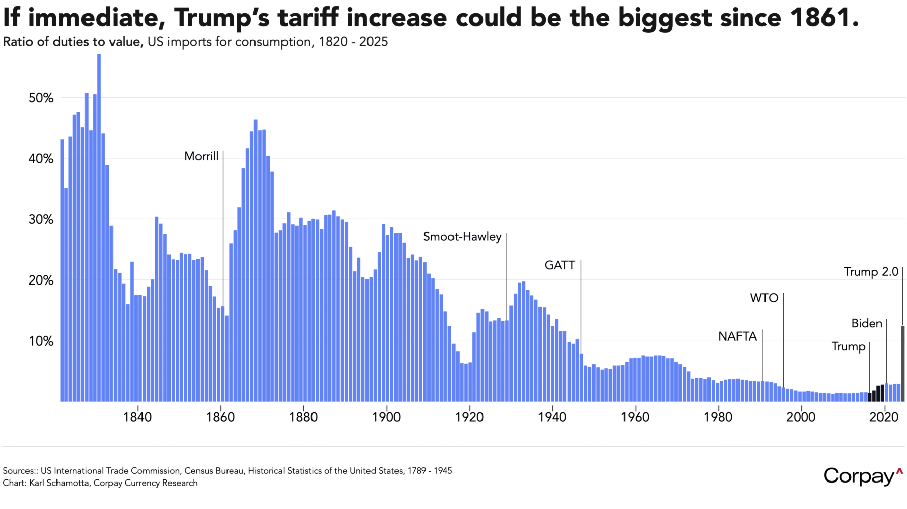 The administration said Saturday it will levy 25 percent import taxes on goods from Canada and Mexico—with Canadian “energy resources” subjected to a lower 10 percent levy—along with an extra 10 percent tariff on imports from China. If implemented immediately and sustained, this would represent the biggest increase in duties since the Smoot-Hawley Tariff Act of 1930—often blamed for deepening the Great Depression—and the largest single-year increase since the 1861 Morrill Tariff—which significantly worsened political strife in the years leading up to the Civil War.