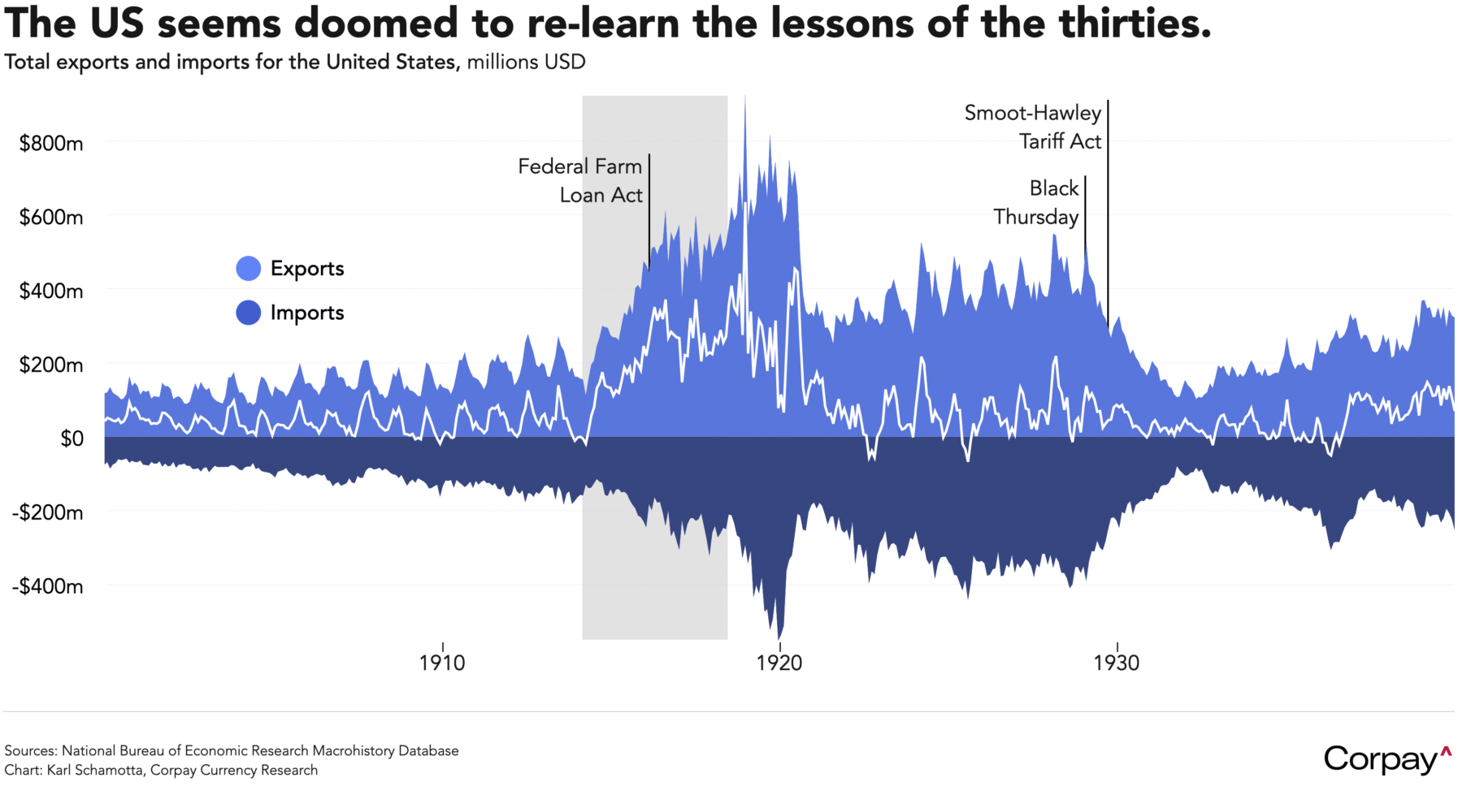 No one will win what the Wall Street Journal this weekend called the “Dumbest Trade War in History”. If hostilities persist, both Canada and Mexico will suffer disproportionately, with both economies likely to topple into recession within weeks. But the US economy will also take a hit, with major multinationals experiencing operating margin compression, consumers dealing with higher costs, and investors grappling with substantially higher levels of uncertainty as countries rush to apply new levies against each other. There’s no reason to imagine that the directional impact on US exports will differ materially from the negative shock that was experienced after a similar escalatory cycle got underway in the early 1930’s.