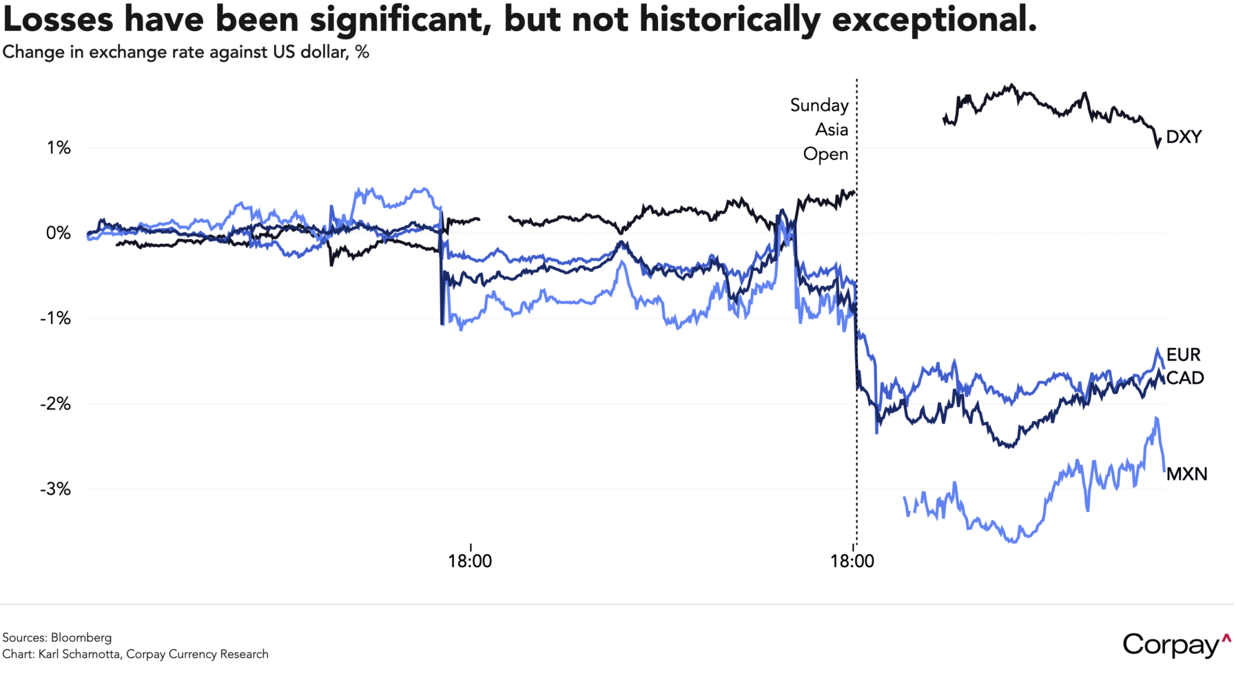 Markets aren’t panicking. The selloff has been relatively restrained, likely reflecting a widespread belief—one that we share—in Trump’s willingness to de-escalate once Trudeau and Sheinbaum offer concessions that can be presented to the media as a victory. Trump has a long history of making outrageous threats only to back down once symbolic displays of obeisance are performed by foreign leaders, and it is possible that this time is no different: the president is scheduled to speak with both leaders in the coming hours, and the next set of headlines could deliver upside gains in financial markets.