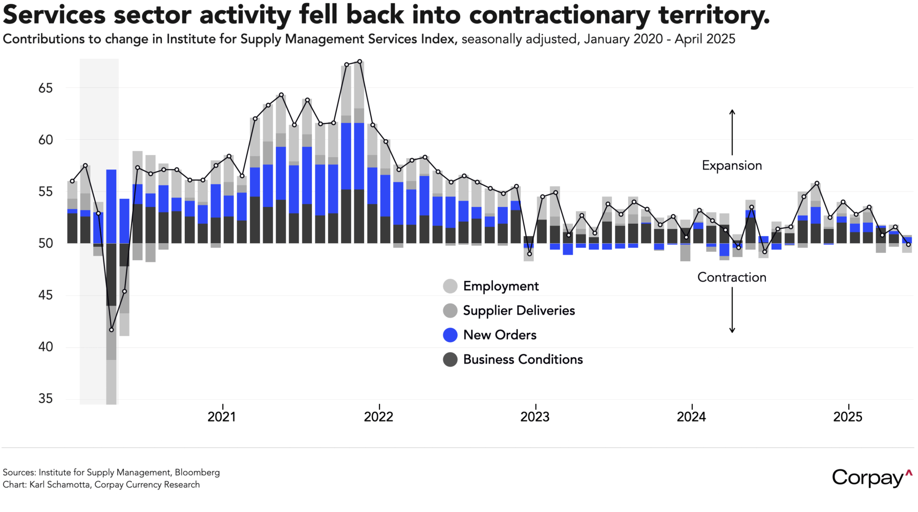 Long-term yields fell yesterday as the US published a series of negative data releases. Automatic Data Processing (ADP) said private sector employment grew at its slowest rate since early 2023 last month, with just 37,000 jobs added against an expected 115,000. The Institute for Supply Management’s measure of services-sector activity (which covers a far wider swath of economic activity than its manufacturing counterpart) fell back into contractionary territory, undershooting expectations for a continued expansion as businesses reported a stagflationary combination of price increases and plunging new orders. The Fed’s Beige Book survey – Jerome Powell’s favoured read on underlying economic conditions – was overwhelmingly tariff-flavoured, with most businesses reporting weaker investment and hiring plans amid elevated uncertainty. And the New York Fed released survey results showing that manufacturers experienced an average 20-percent increase in tariffed goods prices over the last six months, while services businesses saw a 15-percent increase. Although “almost half of businesses reported a decrease in their bottom lines,” only a quarter of respondents fully absorbed the hit, with most passing along higher costs to consumers.