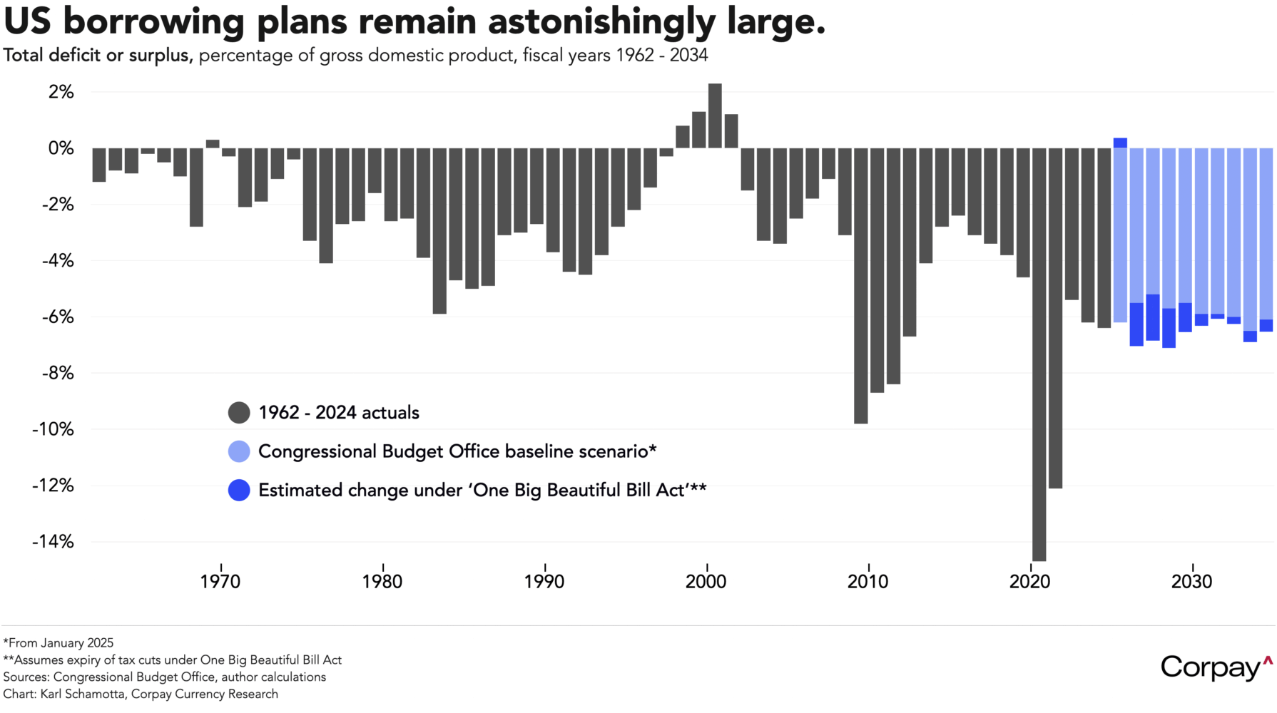 *This projection assumes no additional tariff revenues, but also assumes that tax cuts under the Big Beautiful Bill Act will expire in 2028. A separate analysis from the non-partisan Yale Budget Lab suggests that government revenues could rise by $2.381 trillion by 2034 under the current tariff regime (before substitution effects), but if tax cuts are rolled over before expiry, the gap would expand by $4 trillion over the same time frame, leading to a net $1.4 trillion revenue shortfall.