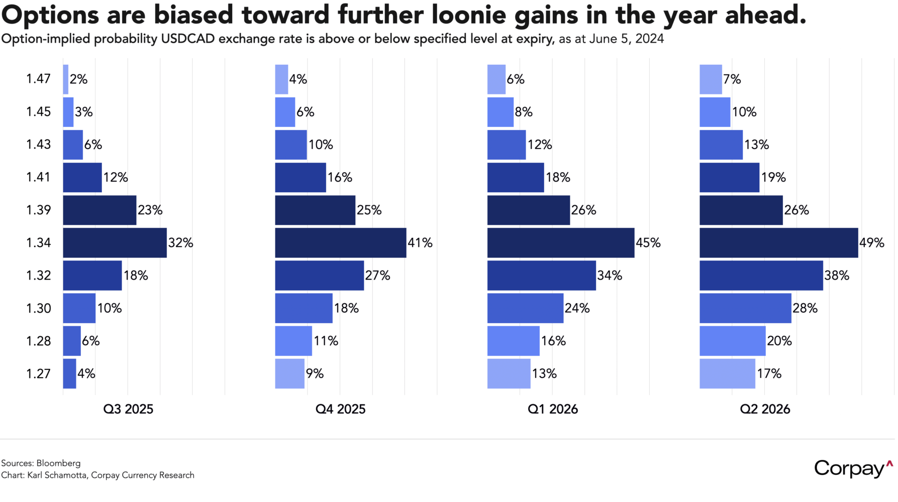 Here in Canada, markets are looking relatively placid after the Bank of Canada delivered an as-expected rate decision yesterday. Policymakers led by Tiff Macklem left borrowing costs unchanged while signalling a willingness to ease policy further in the coming months if price expectations remain well-anchored and the economy displays signs of further weakness. Options traders see the loonie grinding incrementally higher over the remainder of the year as the US economy underperforms and the Fed returns to its rate-cutting path, but “tail risks” remain significant, and this view could be challenged by a resurgence in the greenback or a more prolonged downturn in Canada.