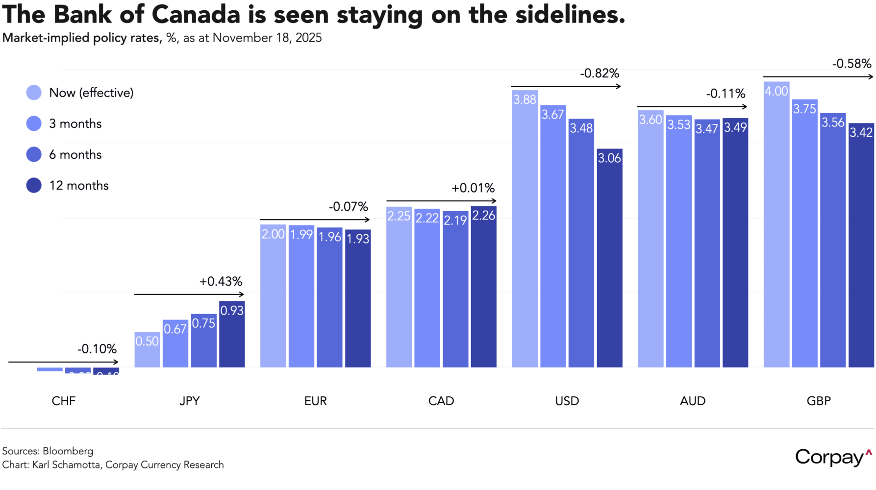 The Canadian dollar remains firmly rangebound as traders brace for a long period of inactivity from the Bank of Canada ahead. The exchange rate barely budged after yesterday’s consumer price report—which showed inflation decelerating a little less than expected in October—and exhibited no response to the passage of Mark Carney’s budget later in the day, suggesting that neither development had any impact on cross-currency rate differentials. To wit, swaps traders are putting just 5 percent odds on a rate cut at the Bank’s December meeting—essentially unchanged from Friday’s 6 percent—and expect Canadian policymakers to adjust rates by less than any of their major advanced-economy counterparts over the next year.