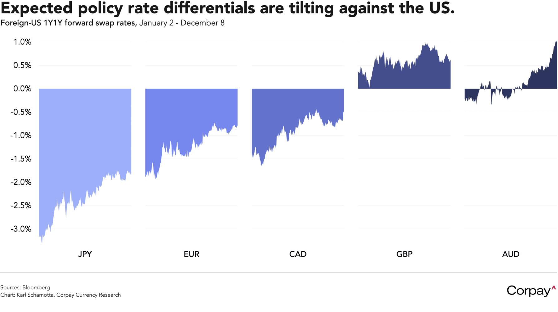 Policy expectations are shifting upward across the advanced economies, threatening to put downward pressure on the US dollar. Swap markets—which had already anticipated tightening from the Bank of Japan and an eventual halt to the Bank of England’s easing cycle—are beginning to price in rate hikes from the Reserve Bank of Australia, Bank of Canada, and European Central Bank, making the Federal Reserve a relative outlier in its drive to ease policy.