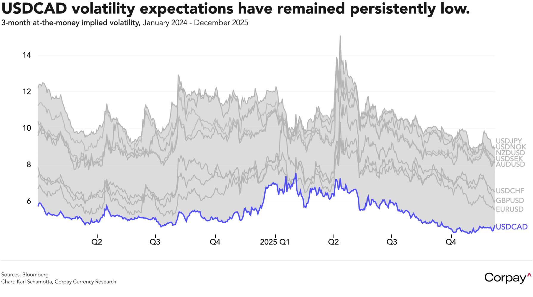 Here in Canada, at least one major bank expects the policy-rate gap with the United States to narrow by roughly 150 basis points over the coming year. Although past experiments—in 2002 and again in 2010—show that such a divergence is not inconceivable, it would require considerable conviction for the Bank of Canada to tighten while the Federal Reserve is still easing. But any move in that direction would almost certainly trigger a sharp appreciation in the Canadian dollar. With implied volatility in the dollar-Canada pair running well below that of other major currencies over the last two years, we suspect markets are underestimating the potential for outsized moves.