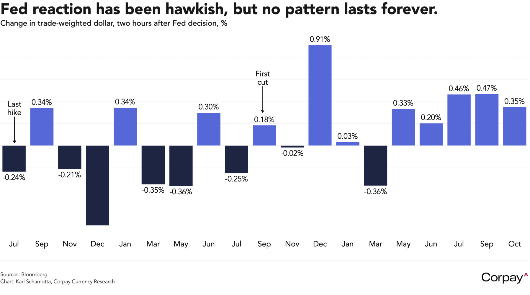 In theory, the dollar could catch a bid. Most observers believe at least two policymakers will dissent against a cut, the median forecast is still seen showing just a single move next year, and Powell himself is expected to warn markets against pricing in further easing in the early new year, arguing that policymakers will need to take time to assess the economy before adjusting rates again. A similar setup has produced an average 0.35-percent rise in the dollar in the two hours following each of the past five meetings. But he may struggle to out-hawk a market already inclined to look through tough talk, and ever-optimistic investors could latch onto even the faintest dovish nuance as evidence that the balance of risks is shifting toward a more aggressive cutting cycle in the new year.