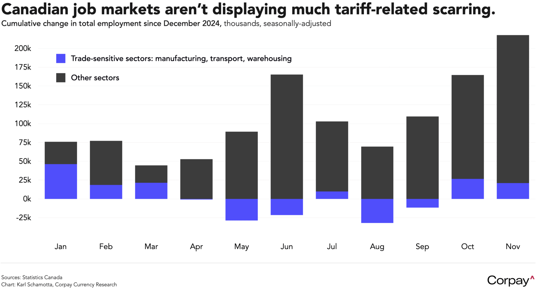 The Canadian dollar is holding territory gained on Friday morning, when a data update showed employment increasing at a faster-than-anticipated pace for a third month in November and the unemployment rate falling four ticks in line with a shrinking labour force, suggesting that other growth engines are helping insulate the economy against a trade-driven downturn. Taken cumulatively, export-exposed industries such as manufacturing, warehousing, and transportation have seen little evidence of job losses this year—despite the Trump administration’s volatile tariff regime—and momentum is emerging elsewhere as the effects of earlier monetary easing take hold and fiscal stimulus begins to gather pace.