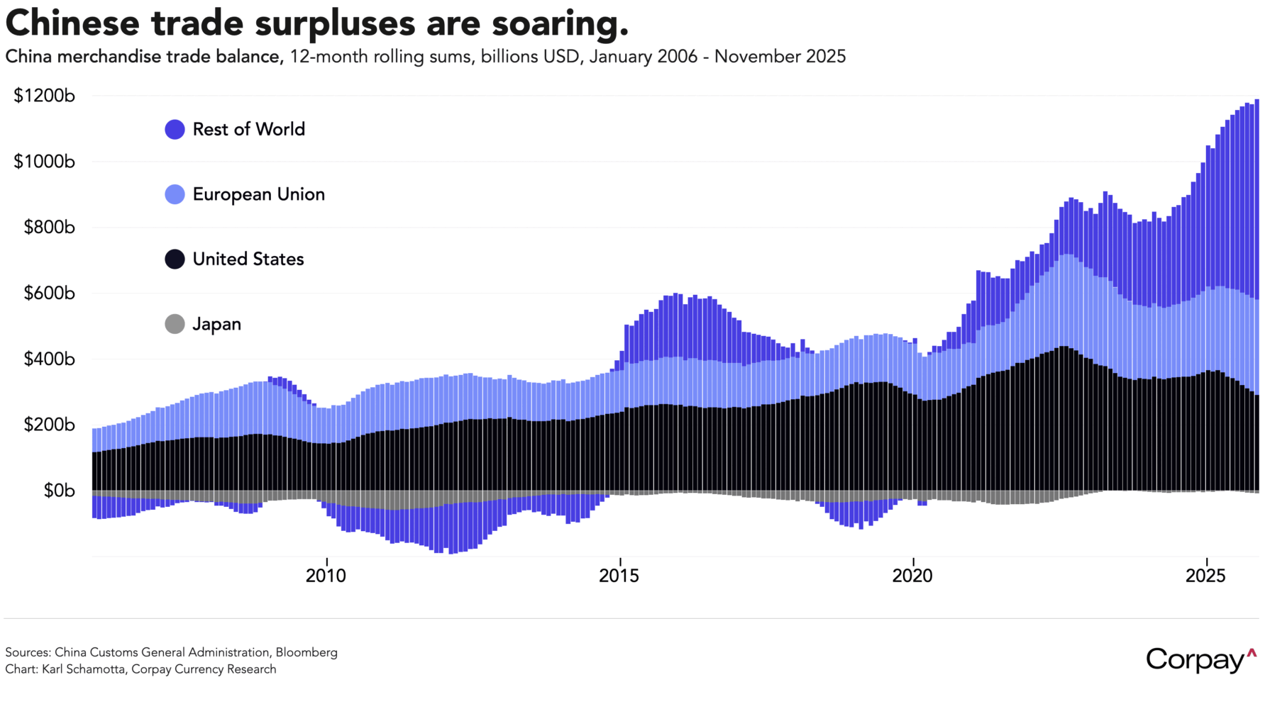 Lastly, we would highlight the fact that the biggest fault line in the global economy continues to widen, threatening to unleash another round of turbulence. According to data published last night, China’s global merchandise trade surplus exploded to almost $112 billion in November, bringing the 12-month rolling total to a record $1.18 trillion as falling direct exports to the US were offset by transshipments through third countries and to other major consumers, including the European Union. As economists have long warned, the patchwork of bilateral, product-specific tariffs implemented by the US this year has not succeeded in narrowing the country’s deficits—only moving them around geographically—and the supply-side growth regime favoured by Chinese policymakers is sending a wave of cheap exports crashing into other areas of the world. If not corrected, this could lead to an economic and political backlash, and to volatility in currency markets.