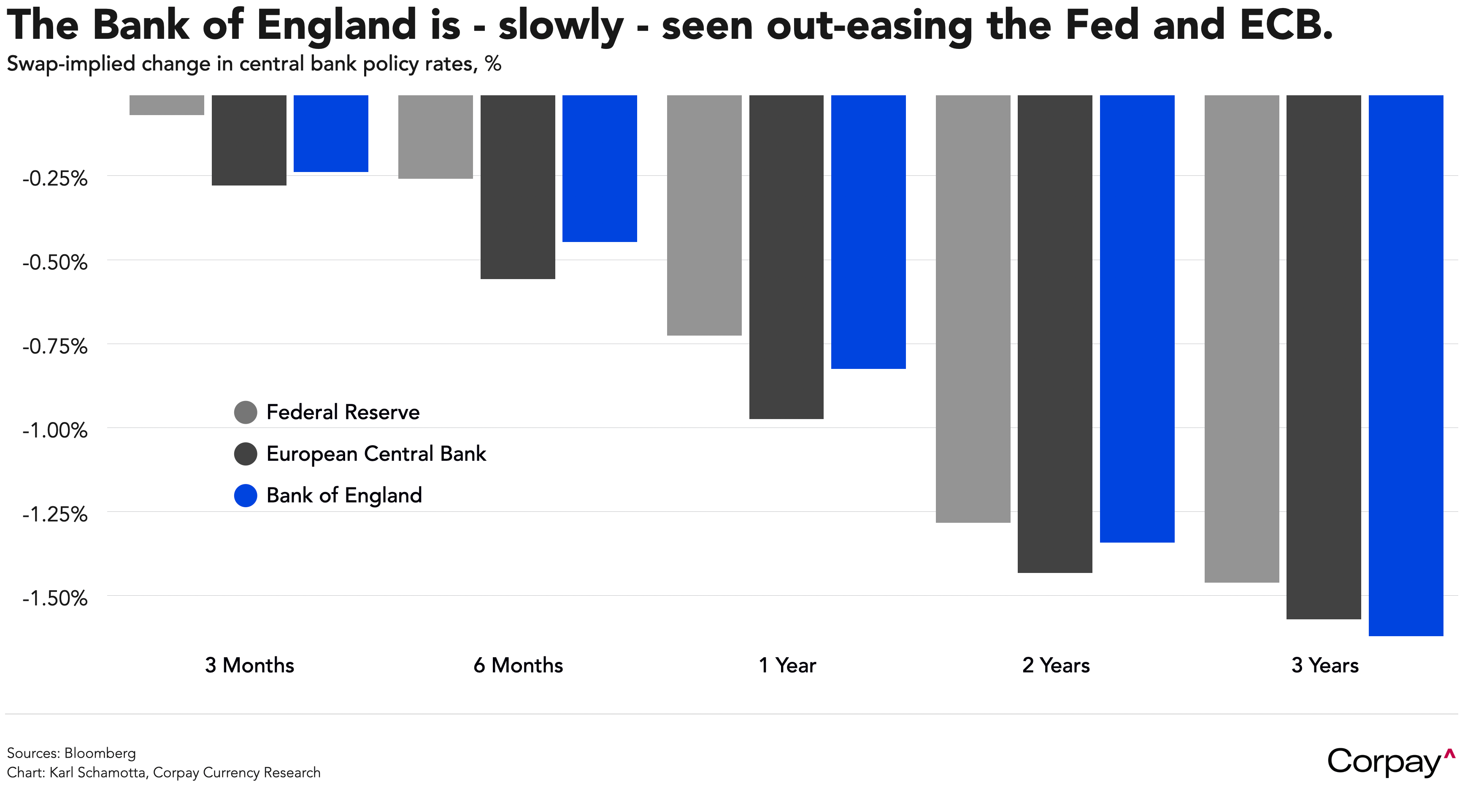 As expected, the Bank of England left its major policy settings unchanged and set the stage for a summer rate cut in this morning’s decision. Bowing to signs of persistent disinflation, Deputy Governor Dave Ramsden joined Swati Dhingra in voting for an immediate rate cut, and the committee hinted that the next two inflation reports could clinch a move, saying it would “consider forthcoming data releases and how these inform the assessment that risks from inflation persistence are receding”. The Bank cut its projection for inflation this year from 2.75 percent to 2.4, and raised the unemployment outlook, suggesting that officials think easing is needed to reduce the burden on the real economy. With markets well prepared for a dovish tilt, the pound is modestly softer and two-year gilt yields are pushing lower as we go to print. Investors expect the UK to slash rates slightly more slowly than the European Central Bank over the coming two years, but to ultimately cut by more than either of its counterparts over a three-year horizon.