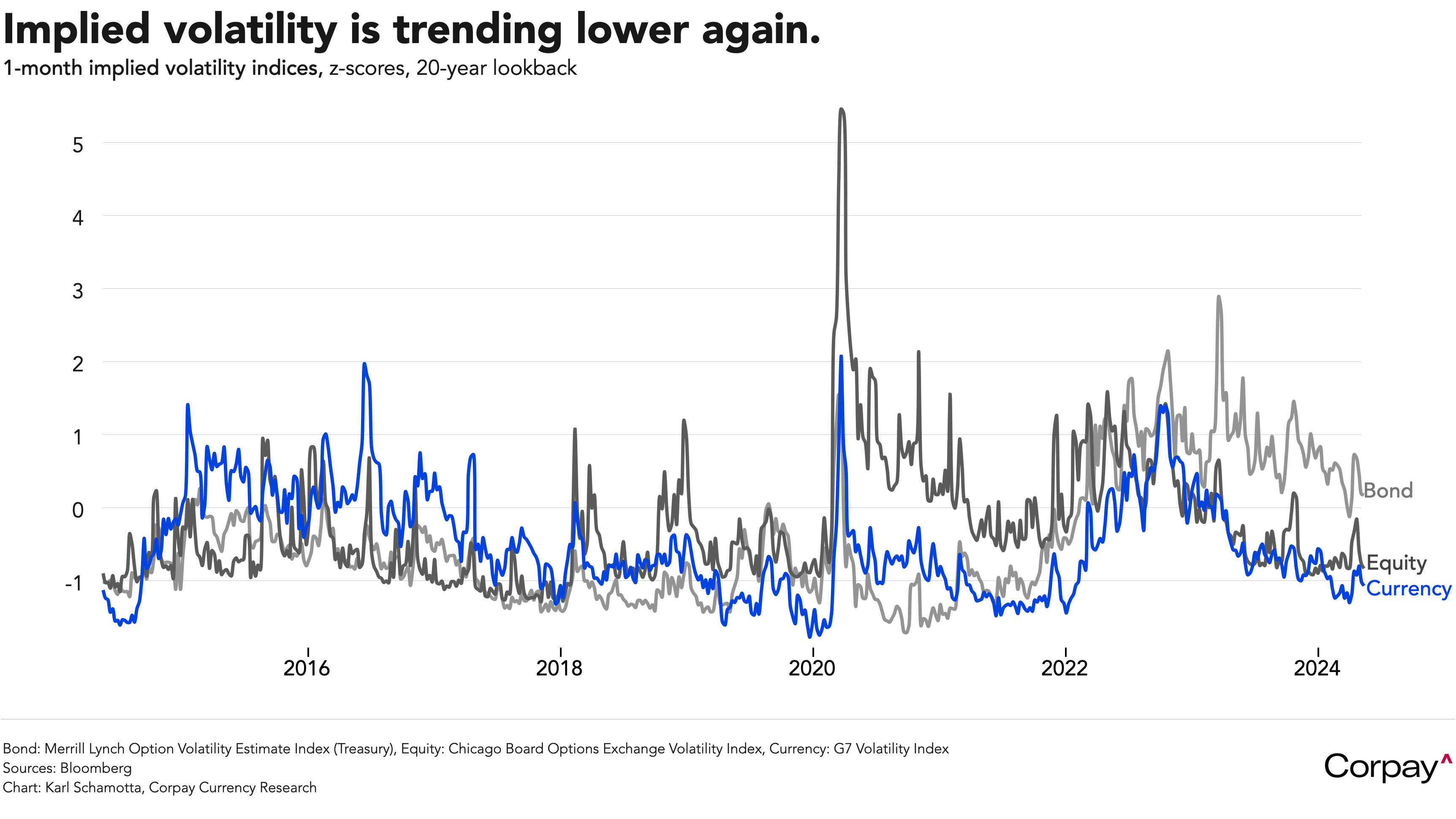 Implied volatility in currency markets is again trending lower, suggesting that traders feel relatively comfortable with the short-term outlook for growth and rate differentials across the major economies. We think slowdown fears could soon reassert themselves in the United States, with a raft of indicators – most importantly, the Institute for Supply Management’s services and manufacturing indices – pointing to softness ahead. It may be too early to expect a pivot, but next week’s producer and consumer price numbers, along with the April retail sales print, could see bets on US exceptionalism begin to fade, triggering another round of turbulence in foreign exchange rates.