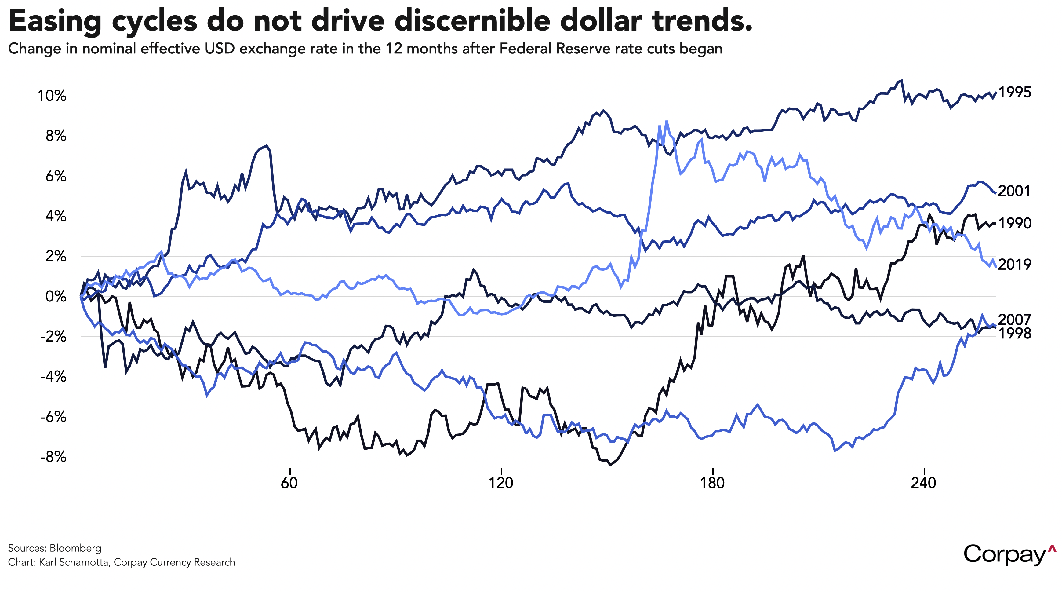 With underlying economic data and Fed officials pointing in the same direction, investors are back to pricing four quarter-point rate cuts this year, implying at least one half-point move in the three meetings scheduled between now and December. Real currency market momentum is unlikely to develop before Powell’s comments are released tomorrow morning, but could also fail to emerge over the coming months. A record of the Fed’s last six easing cycles shows no discernible trend in the trade-weighted dollar in the year following the first rate cut, suggesting that the intersection between US fundamentals and the global backdrop can have bigger implications than the simple direction of policy.