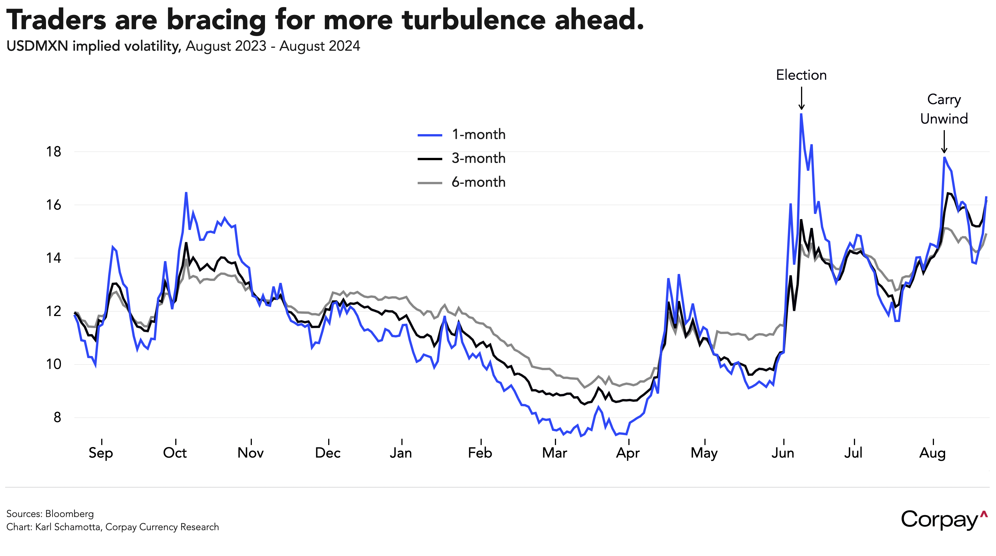 In contrast with its major counterparts, Mexico’s peso remains incredibly volatile, moving from one extreme to another in just the last few days. With carry traders in a trigger-happy mood, domestic economic fundamentals showing signs of a slowdown, and Claudia Sheinbaum’s incoming government promising to follow through on Andres Manuel Lopez Obrador’s effort to dismantle checks and balances in the legal system, market sentiment has shifted toward assuming greater downside risks in the months ahead. Implied volatility – a measure of expected turbulence in the exchange rate – has marched higher across one-, three- and six-month tenors, suggesting that market participants don’t see pressures easing anytime soon.