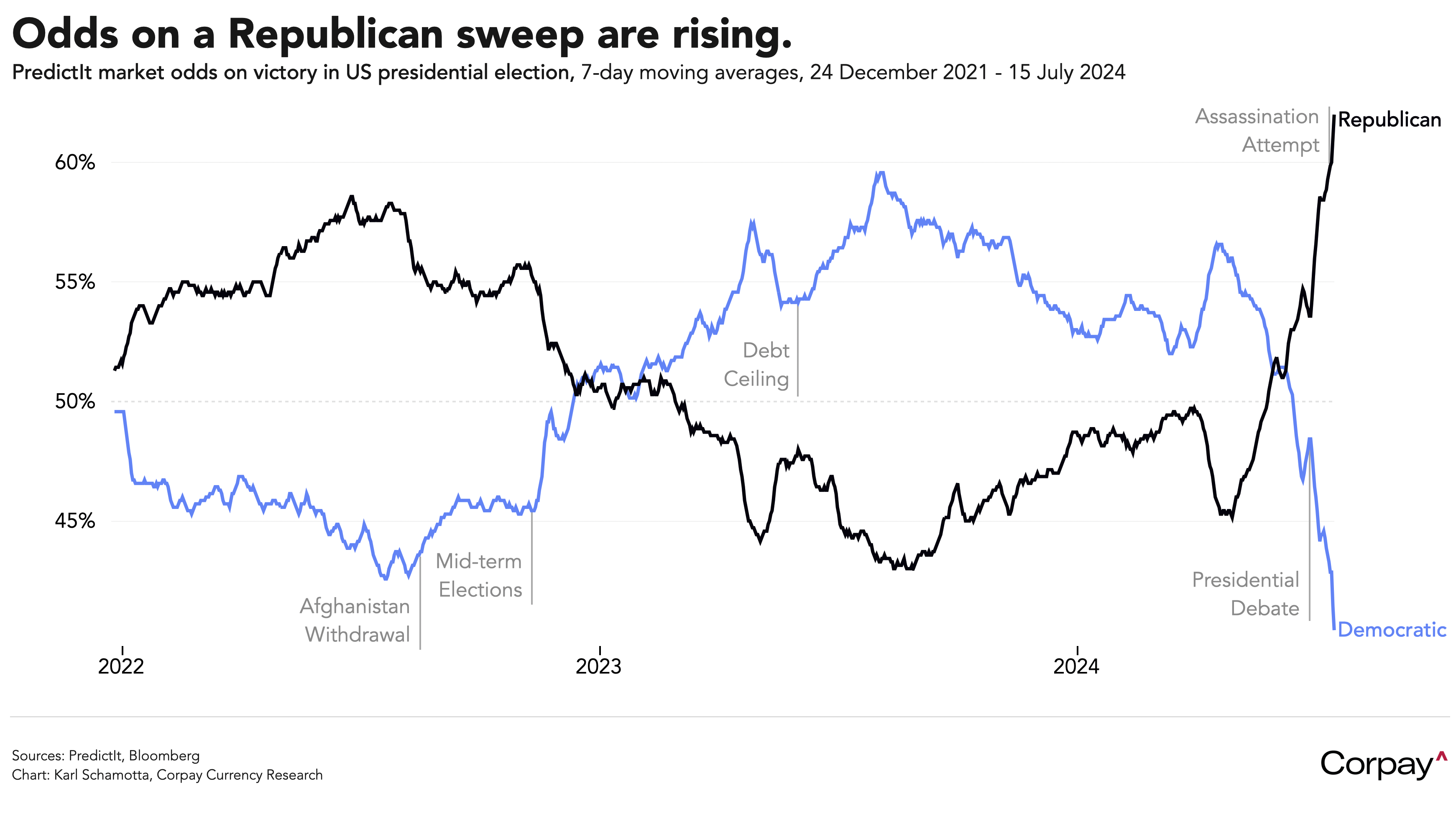Donald Trump could yet snatch defeat from the jaws of victory. As others have pointed out, Teddy Roosevelt managed to lose an election just three weeks after being shot in October 1912, and Reagan’s approval rating quickly reverted lower after John Hinckley took a potshot at him in 1981. At the best of times, US politics is difficult to predict, but this isn’t the best of times, and the path forward remains impossible to extrapolate.