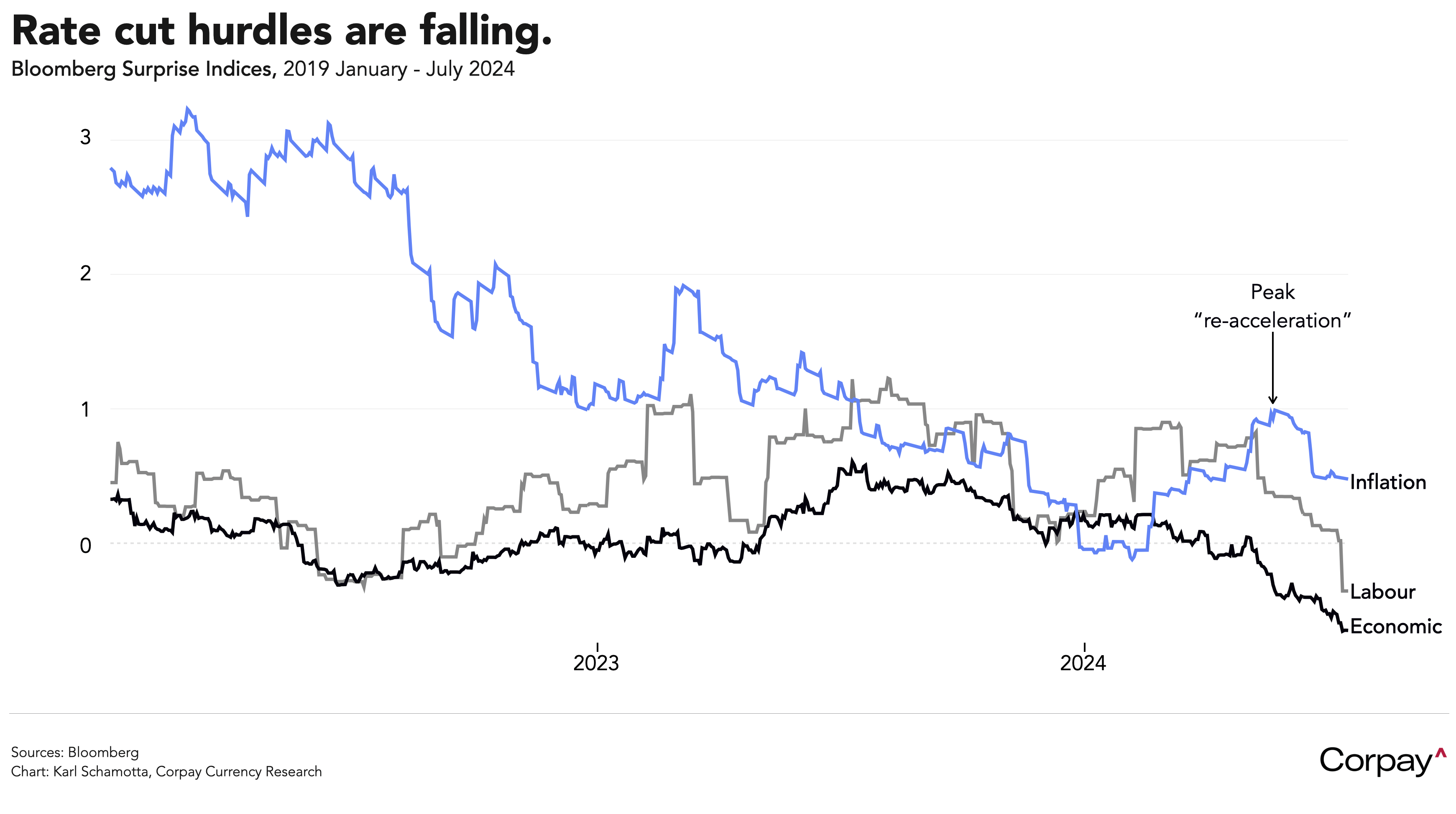 Bloomberg’s surprise indices, which measure realised data relative to consensus market expectations, are now moving in sync, with inflation, labour market, and overall growth indicators all slowing at the same time. Tomorrow’s retail sales data could impact rates curves, but when Jerome Powell sits down for an interview with Carlyle Group co-founder David Rubenstein at the Economic Club of Washington just after noon today, he may suggest that the central bank is closer to achieving the confidence needed to begin easing policy, shifting the market focus toward the second half of the Fed’s dual mandate. Simply put, many of the factors that have been taking some air out of the dollar’s ascendance remain intact, despite the shock and magnitude of the weekend’s events.
