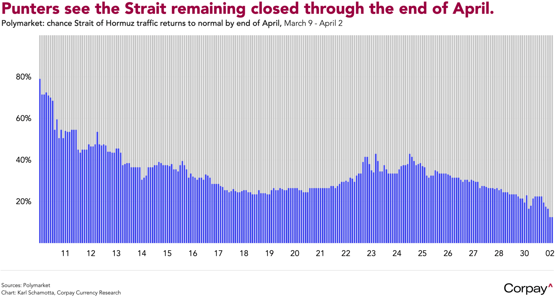 Punters* are betting on a prolonged disruption in the Strait of Hormuz. According to data published by the Polymarket prediction market, bettors are assigning just 13 percent odds to a reopening of the Strait by the end of April, and only 38 percent by the end of May, implying a prolonged period of painfully-high energy prices.