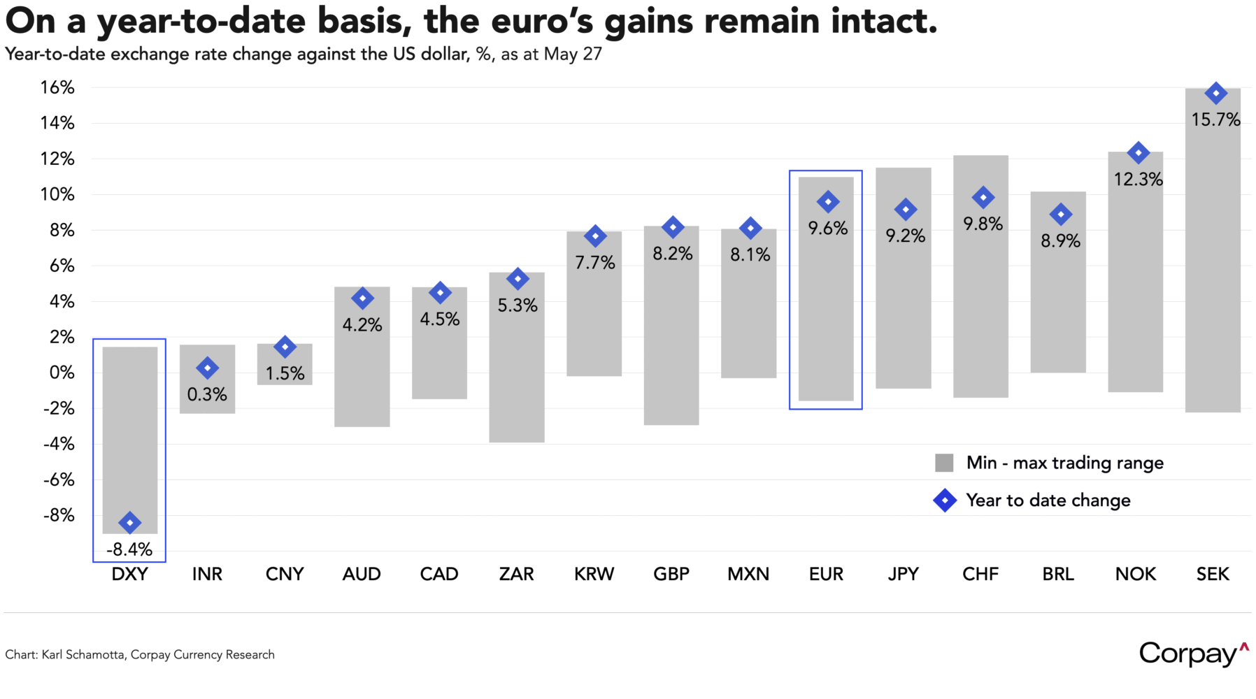 The euro is trading near Friday’s open, and is clinging to a circa-9.6-percent gain on a year-to-date basis after Donald Trump’s latest round of tariffs proved remarkably short-lived. In a social media post on Friday morning, the president said he planned to impose a 50-percent tariff on imports from the European Union by June 1 – triggering a steep selloff in global markets – only to postpone the action to July 9 on Sunday afternoon after “a very nice call” with European Commission President Ursula von der Leyen.