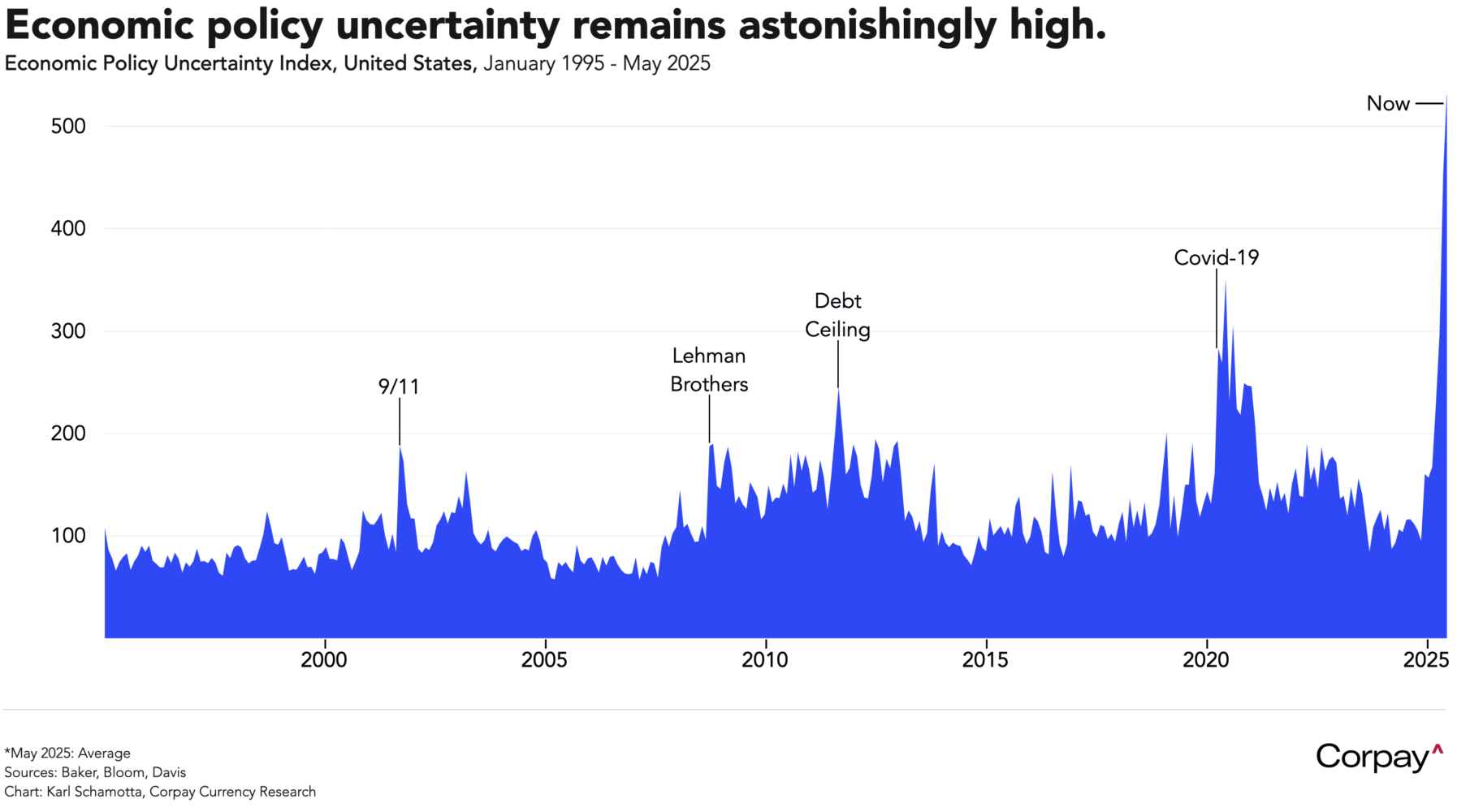Caution is warranted. Markets risk overreacting to potentially-transitory shifts in high-frequency data, given that highly complex “bullwhip effects” are radiating across the global economy as the technology investment cycle matures and the Trump administration’s policy reversals wreak havoc on consumer sentiment levels, supply chains, and investment plans. Economic policy uncertainty is likely to remain extraordinarily high, given that the president has now modified tariff levels at least 56 times since January 20 – and that he appears to see periods of calm as opportunities to enact more changes. Directional exchange rate forecasts are useless in this environment, and attempting to top-tick trends remains dangerous and futile – instead, it’s best to look at short-term market fluctuations as opportunities to lock in hedges at levels that are attractive from a bottom-line standpoint.