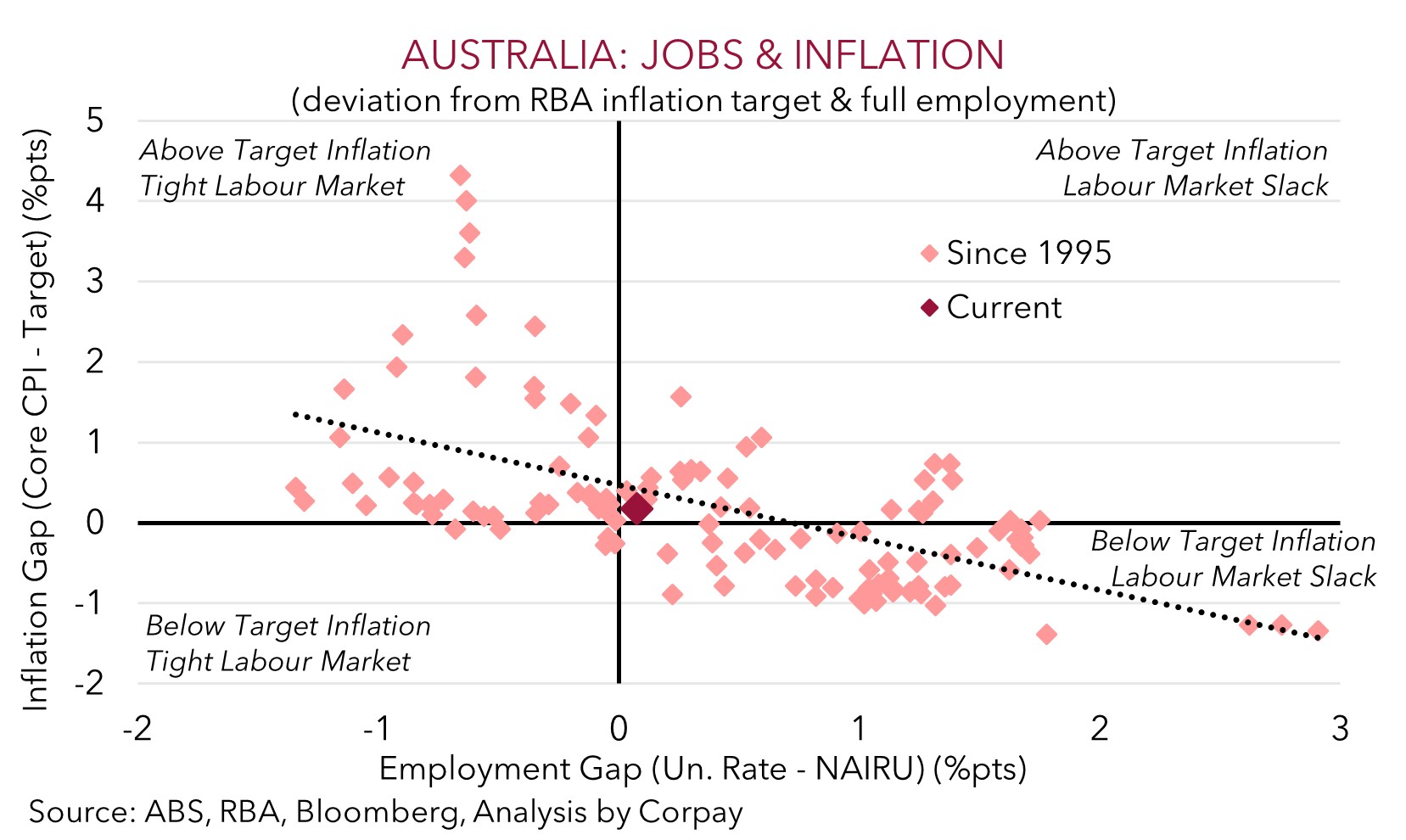 RBA Governor Bullock speaks today (11:05am AEDT). The event has a Q&A so there may be opportunity to gauge Governor Bullock’s thoughts on the tension between inflation and labour market developments. As our chart shows, it is an interesting time with core inflation still lingering above the RBA’s target while labour market conditions are cooling. On the latter, as outlined earlier this week, we think markets may have jumped to aggressively to last week’s jobs report and are pricing in too high a chance of a RBA rate cut in November (the market is assigning it a ~60% probability). In our judgement, broader measures don’t show a significant loosening in the jobs market with the average of the unemployment rate over Q3 broadly in line with the RBA’s ~4.3% projection. Furthermore, based on the monthly indicator Q3 inflation (due 29 October) may come in above the RBA’s forecasts. We think confirmation in the quarterly CPI that the inflation pulse remains firm could temper the markets enthusiasm about near-term RBA rate cuts, which if realised may give the AUD a helping hand.