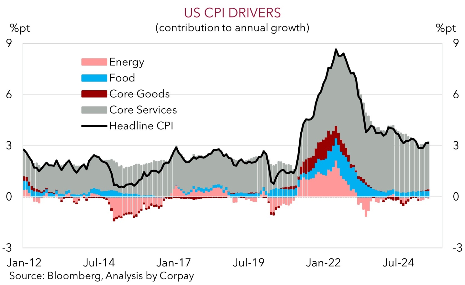 That said, ahead of the quarterly Australian CPI the AUD (and NZD) will have to contend with tonight’s US inflation data (11:30pm AEDT). As mentioned above, we think US core inflation risks underwhelming consensus predictions because of ‘services’ prices. If this ends up being the case we think expectations looking for a series of US Fed interest rate cuts should be reinforced and this in turn might generate downward pressure on the USD.