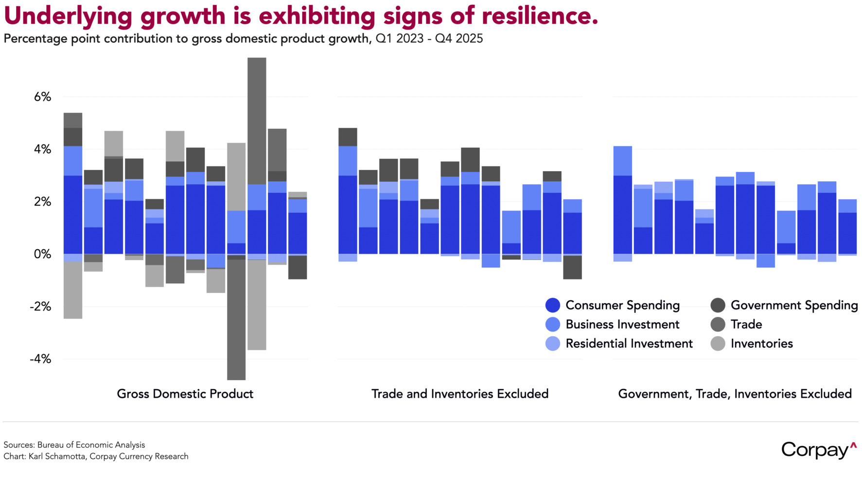However, measures of underlying growth remained relatively robust. Final sales to private domestic purchasers—sometimes seen as a cleaner read on underlying fundamentals—climbed at a respectable 2.4-percent pace in the fourth quarter. With government spending set to mechanically boost growth in the current quarter, and other tailwinds coming in, we suspect the economy’s momentum will hold up in early 2026.