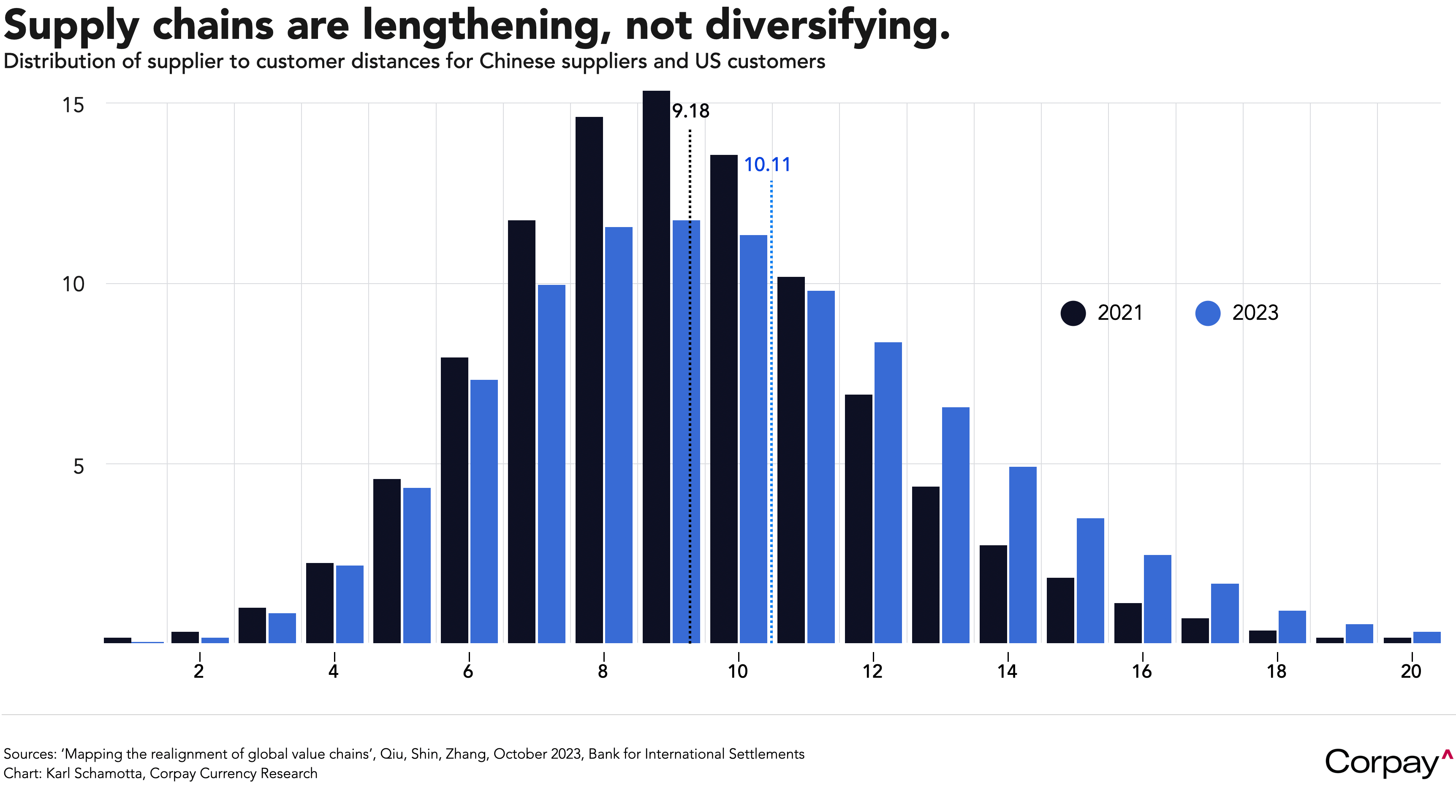 China’s renminbi is drifting lower ahead of an expected increase in tariffs from the Biden administration. As soon as next week, President Biden is expected to follow his predecessor in announcing new taxes on Americans buying Chinese-made steel, aluminum, electric vehicles, batteries, and solar cells. As with President Trump’s earlier efforts, we suspect this won’t materially impact Chinese trade surpluses: the country’s exports of industrial metals to the US are extremely small, its electric vehicles are already essentially locked out of American markets by auto tariffs, and other manufacturers are well practised in evading existing trade sanctions by routing products through third countries. An examination of trade imbalances in countries like Vietnam and Mexico shows that trade deficits with China have risen in proportion to trade surpluses with the United States, suggesting that a relatively small share of value-added work is happening domestically. And research from the Bank for International Settlements indicates that supply chains have generally lengthened, but have not diversified in recent years, implying that China remains the ultimate source for a significant share of US imports.