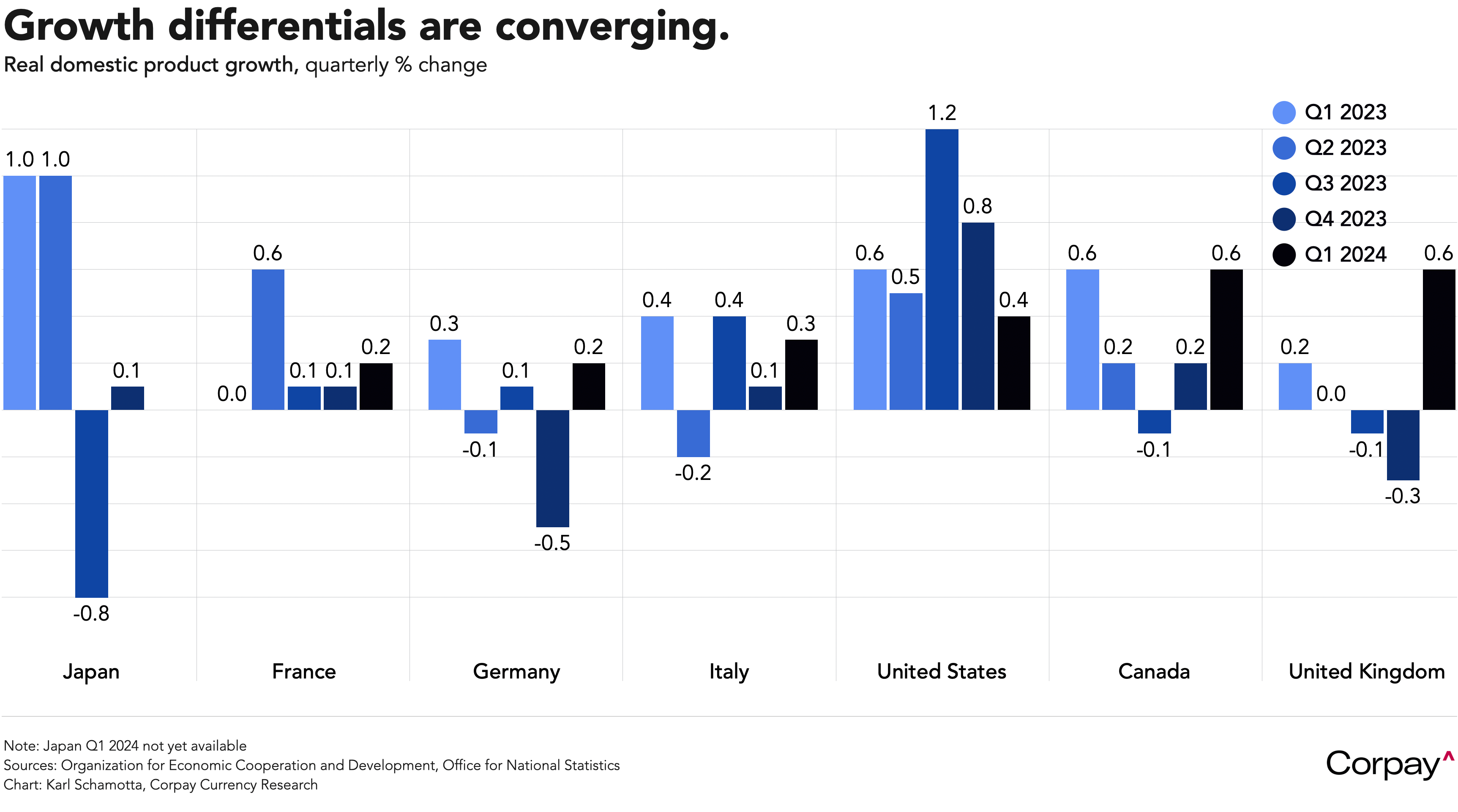 Data out this morning showed growth in the British economy accelerating by far more than forecast in the first quarter. Gross domestic product climbed 0.4 percent in March, marking a 0.6-percent expansion in the first three months of the year as retail sales and business investment powered the economy out of last year’s mild downturn. The pound inched higher even as easing expectations for the Bank of England’s next meeting remained undimmed, with markets assigning roughly coin-toss odds to a move. In yesterday’s post-decision press conference, Governor Bailey said a rate cut in June was “neither ruled out, nor a fait accompli” and investors are largely in agreement.