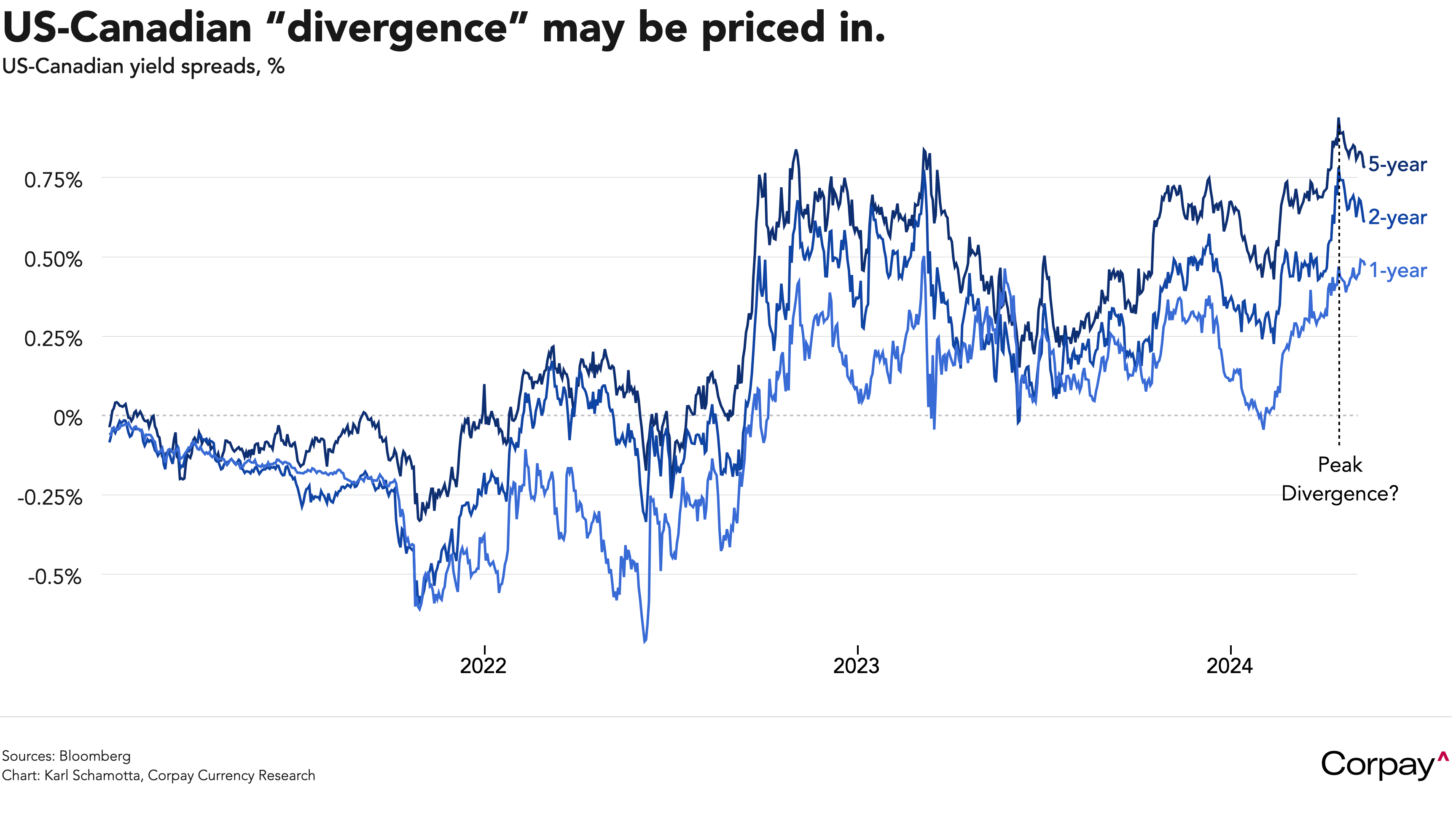 Ahead of this morning’s Canadian jobs report, yield differentials between US and Canadian government bonds suggest that the central bank “divergence” trade may have peaked in mid April. The Bank of Canada is seen cutting rates more sharply over the coming year, with the policy rate declining almost 90 basis points relative to a 75 basis point fall in the Fed Funds rate, but the greenback is expected to maintain a healthy yield premium over the loonie across all time horizons. The gap in two- and five-year yields – typically more important for driving currency market outcomes – has narrowed in recent weeks as US data has softened. To put it more bluntly: a more aggressive easing campaign by the Bank of Canada has been priced in for a while, and is very likely fully incorporated in the current exchange rate. Incoming data – like today’s employment print – will determine whether this gap in expectations remains intact, widens further, or begins to shrink.