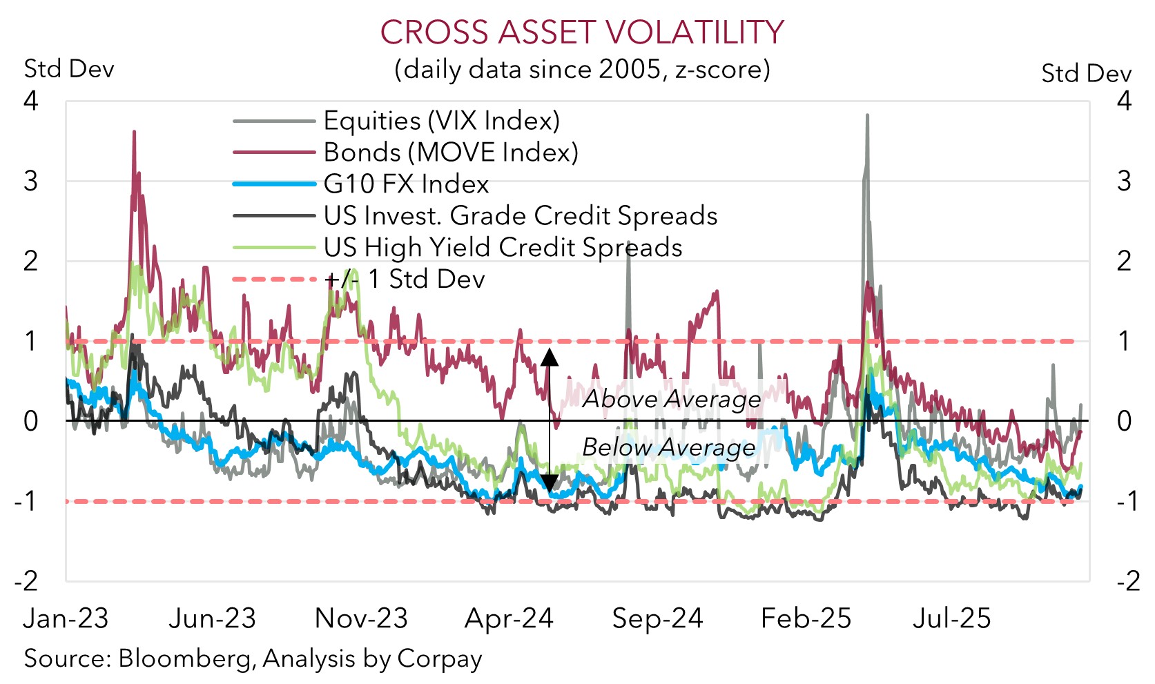 Looking ahead, the monthly China activity data is released today (1pm AEDT). This may generate more intra-day AUD volatility. However, on balance, we remain of the view that an improvement in US/China trade relations, diverging policy trends between the RBA and other central banks such as the US Fed, favourable yield spreads, and/or firmer growth in China as its stimulus push gains traction should help the AUD grind higher into year-end and over early 2026.