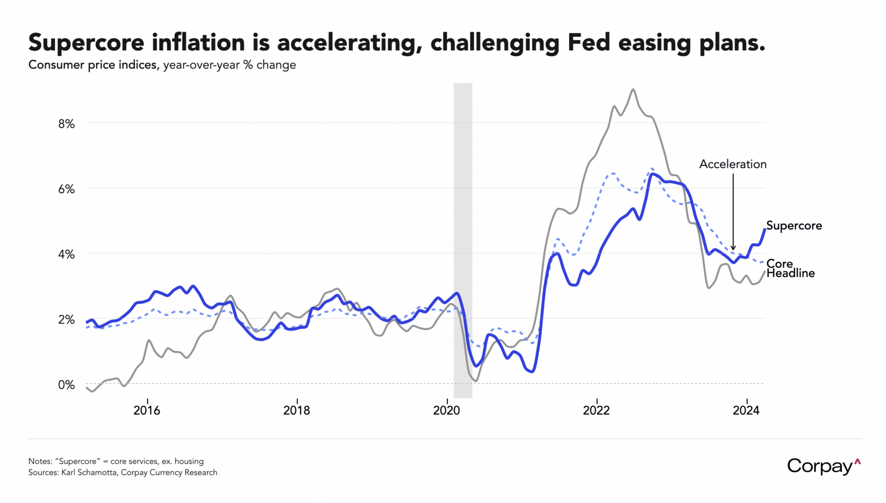 According to our estimates, the so-called “supercore” measure—which captures core services minus housing—rose 3.8 percent relative to a year prior, up from 4.3 percent in February, and far too hot for the Federal Reserve’s comfort.