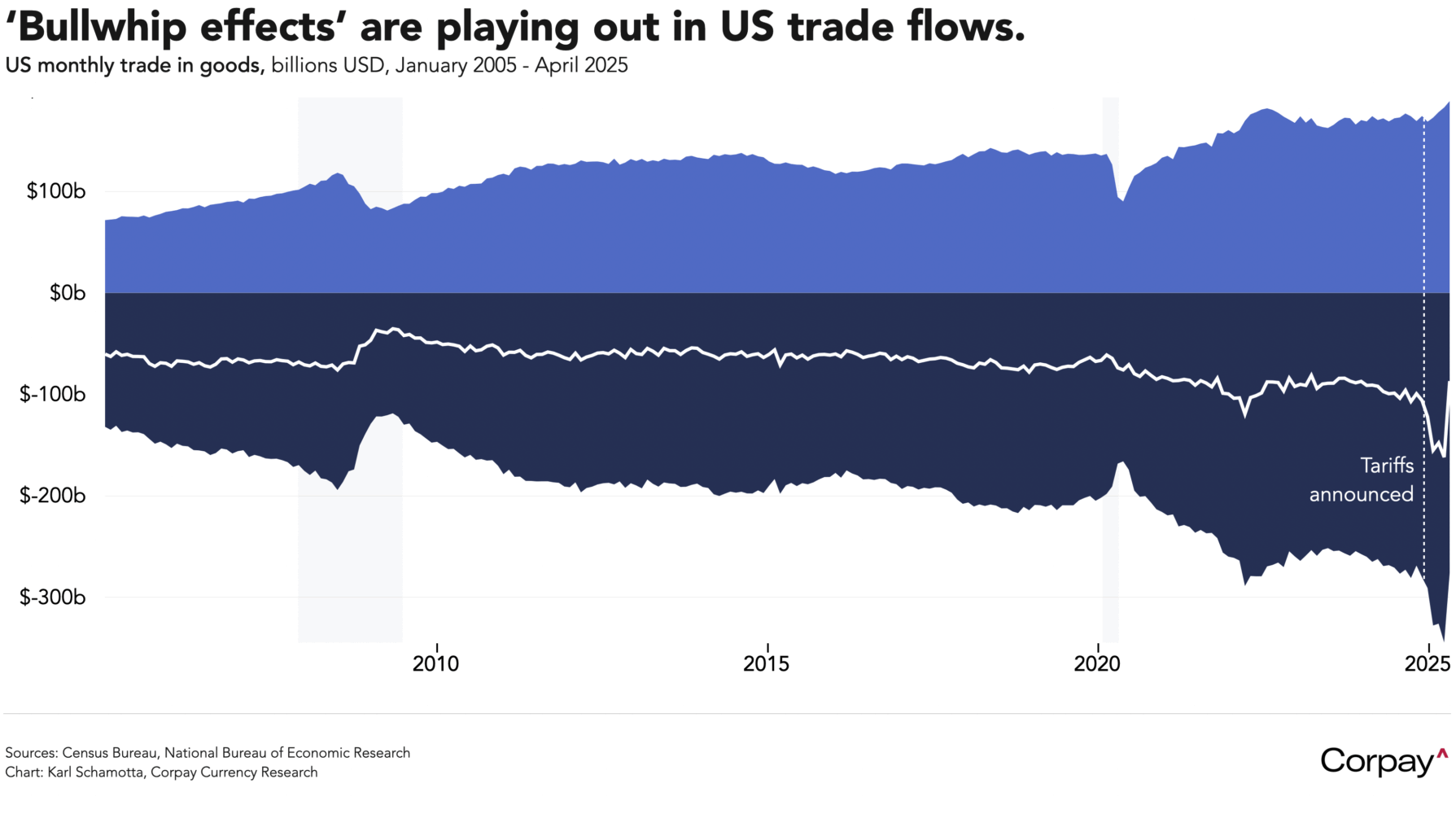The US trade deficit narrowed in April by the most on record, falling 55.5 percent from the prior month as imports plunged. Data from the Census Bureau yesterday showed goods and services imports falling 16.3 percent in the month, while exports rose 3 percent. If sustained, this could represent a narrowing in American trade imbalances. But a quick glance at a longer-term chart illustrates that imports simply normalised after a brief surge in front-running efforts ahead of the implementation of the Trump administration’s tariffs. It remains difficult to assess the degree to which the import taxes will lead to a re-routing in trade flows, with a conclusive answer likely a few months away — at the least.