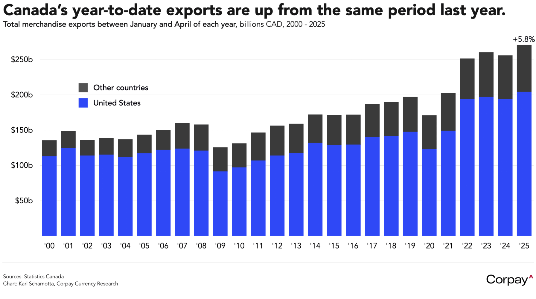 But ‘bullwhip effects’ are playing a role here as well. Although month-over-month changes admittedly look extreme, total Canadian exports in the first four months of this year were up 5.8 percent from the same period last year as businesses and consumers rushed to move products across borders before trade levies were imposed. We think shipment volumes to the US will ultimately settle at lower levels as American consumers lose buying power – and this will exert long-term drag on Canada’s economy – but the path there could be bumpy as inventories are rebuilt, and tariff increases on the rest of the world in the last two months mean the country is now trading from a relatively-privileged position.