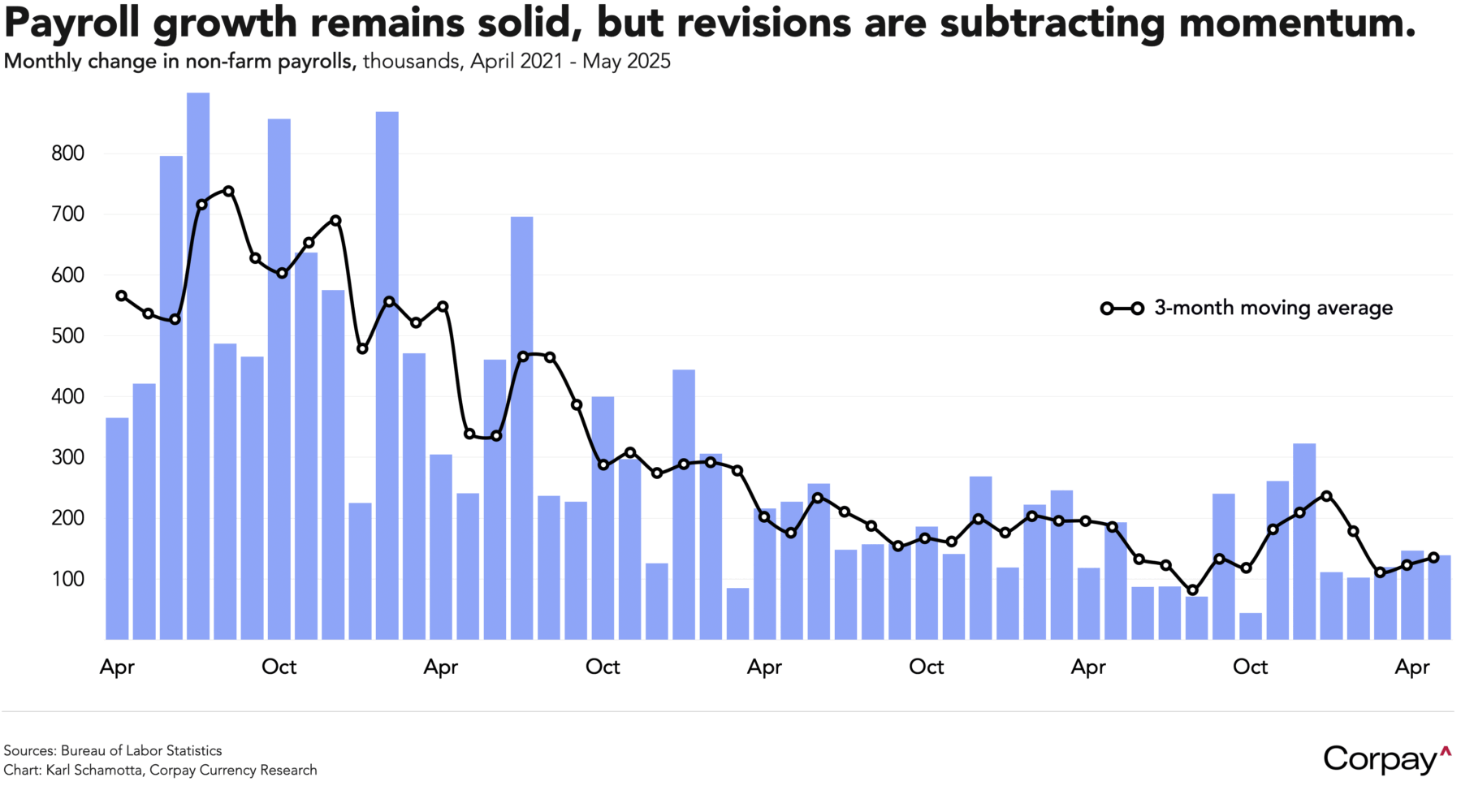 The US job creation engine maintained its modest momentum last month, keeping the Federal Reserve sidelined for now. According to the Bureau of Labor Statistics, 139,000 jobs were added in May – representing an overshoot relative to the 125,000-consensus forecast – and the unemployment rate held at 4.2 percent, as expected. Average hourly earnings climbed 3.9 percent, pointing to relative resilience in aggregate household incomes. However, the previous two months were revised lower by a cumulative 95,000 positions, and the manufacturing sector shed 8,000 jobs.