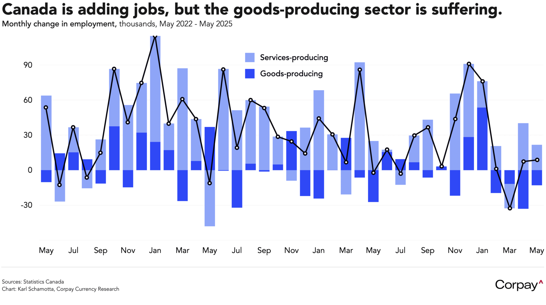 Canada added more jobs than expected in May – helping to ratify the Bank of Canada’s cautious messaging earlier in the week even as the overall labour market remained weak. According to Statistics Canada, 8,000 positions were created in the month, but the unemployment rate climbed to 7 percent from 6.9 percent previously and the goods-producing sector continued to shrink as factory shutdowns and a surge in policy uncertainty clobbered hiring intentions. Consensus estimates had pointed to roughly -10,000 jobs lost, with unemployment seen pushing up to 7.0 percent. Average hourly wages for permanent employees – a variable typically closely watched by central bankers as they work to assess the – rose 3.5 percent from a year earlier, accelerating from the prior month’s 3.2-percent print.