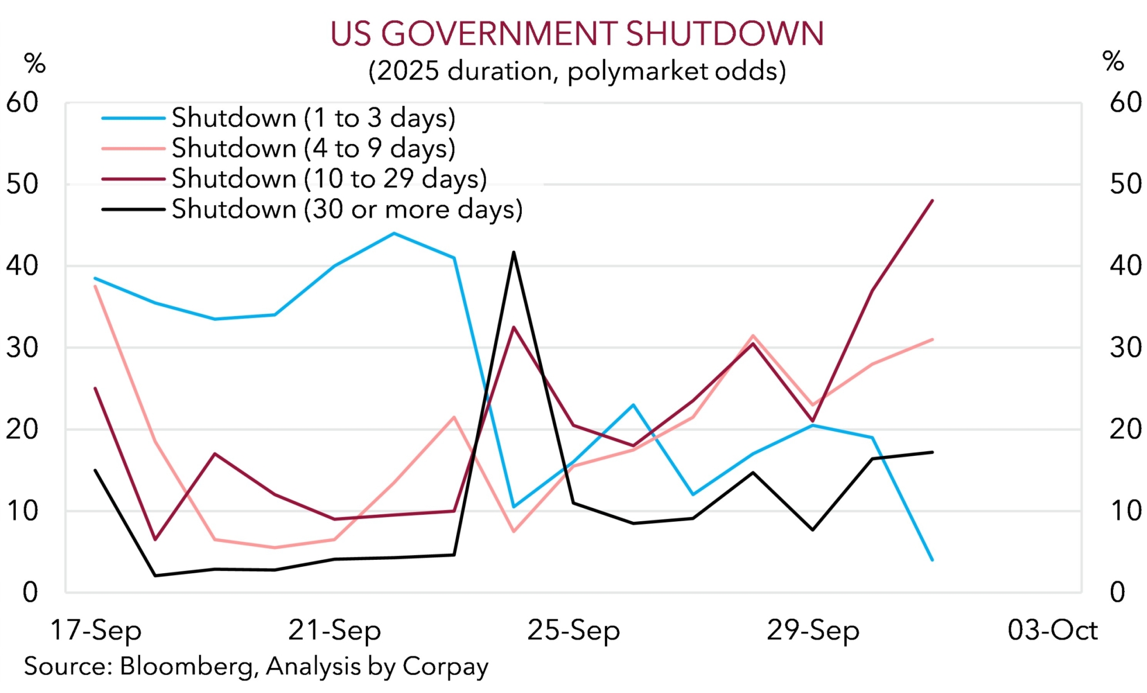 In terms of the US Government Shutdown there doesn’t look like there is any sense of urgency from either side to get a deal done quickly. And with this iteration not having the ‘debt ceiling’ (and risk of US default) attached to it things might drag out for a while. As our chart shows, market odds are currently favouring a 10-29 day duration. This is within the ballpark of the last few shutdowns. US government agencies are activating contingency plans that will sideline federal workers. It is estimated ~750,000 employees could be furloughed. This will mechanically depress US economic activity over the near-term with past shutdowns shaving ~0.1%pts off US GDP growth each week the shutdown lasted.