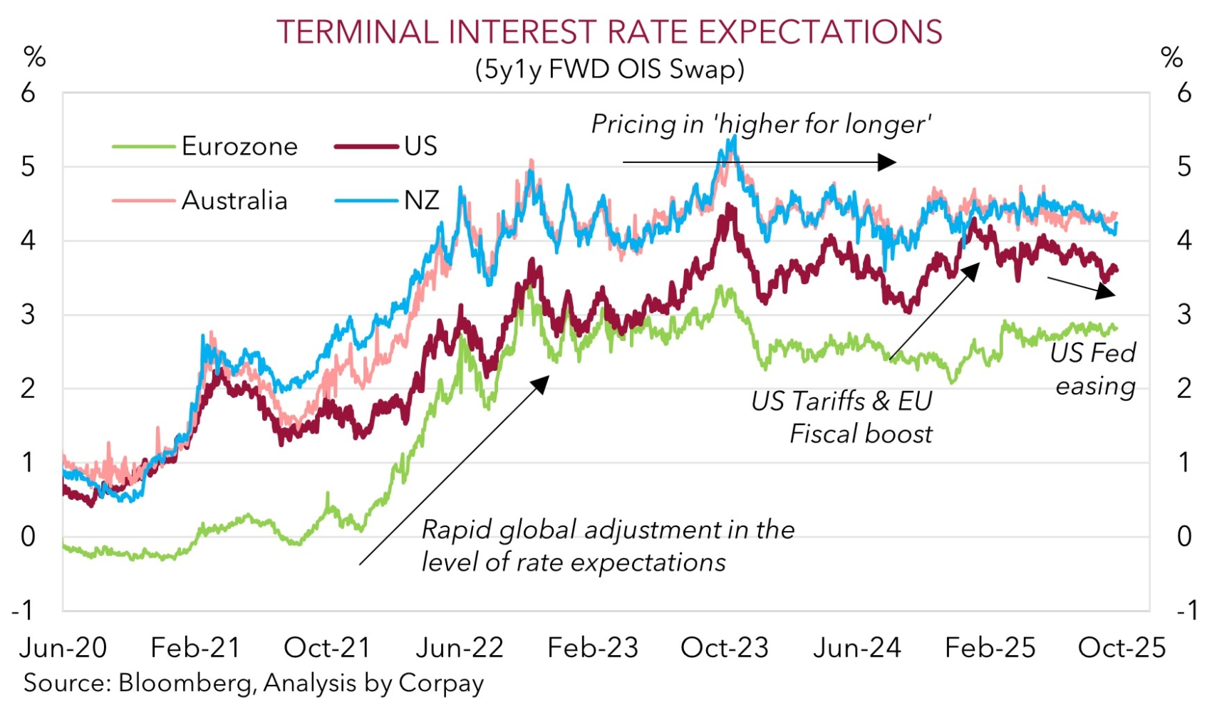 Today in Australia the monthly trade and household spending figures are due, as is the RBA’s semi-annual Financial Stability Review (11:30am AEST). Household spending has been picking up recently, on the back of more services related activity and as past rate cuts work their way through the system. The improved momentum across parts of the Australian economy, particularly household spending, combined with stickiness in inflation and resilient labour market are reasons why we (and the market) think further RBA rate cuts are likely to be limited and drawn-out. Markets are now only fully pricing in the next RBA reduction by next March with another move after that not discounted.
