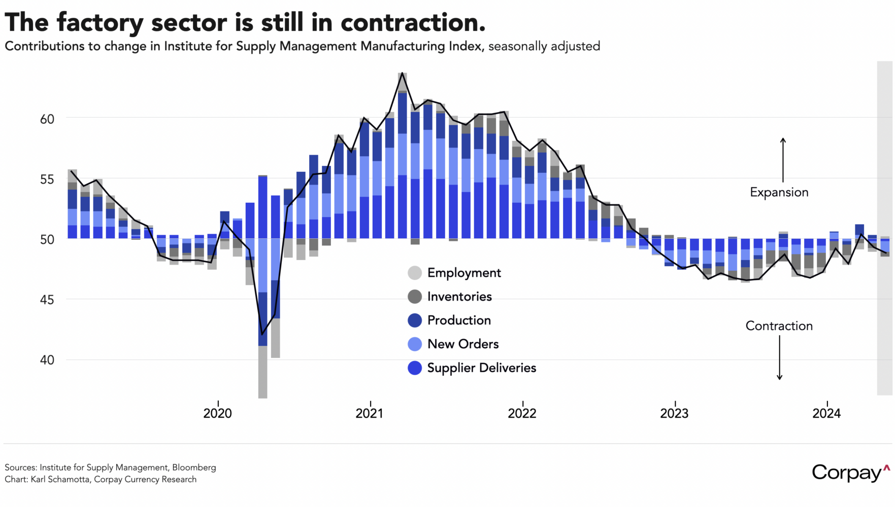 But the jury is still out. Although the manufacturing sector maintains a stranglehold on the popular imagination, it is the services sector that drives the bulk of US economic activity. Tomorrow’s services survey from Institute for Supply Management, and Friday’s non-farm payrolls report should give us a far more accurate understanding of underlying conditions.