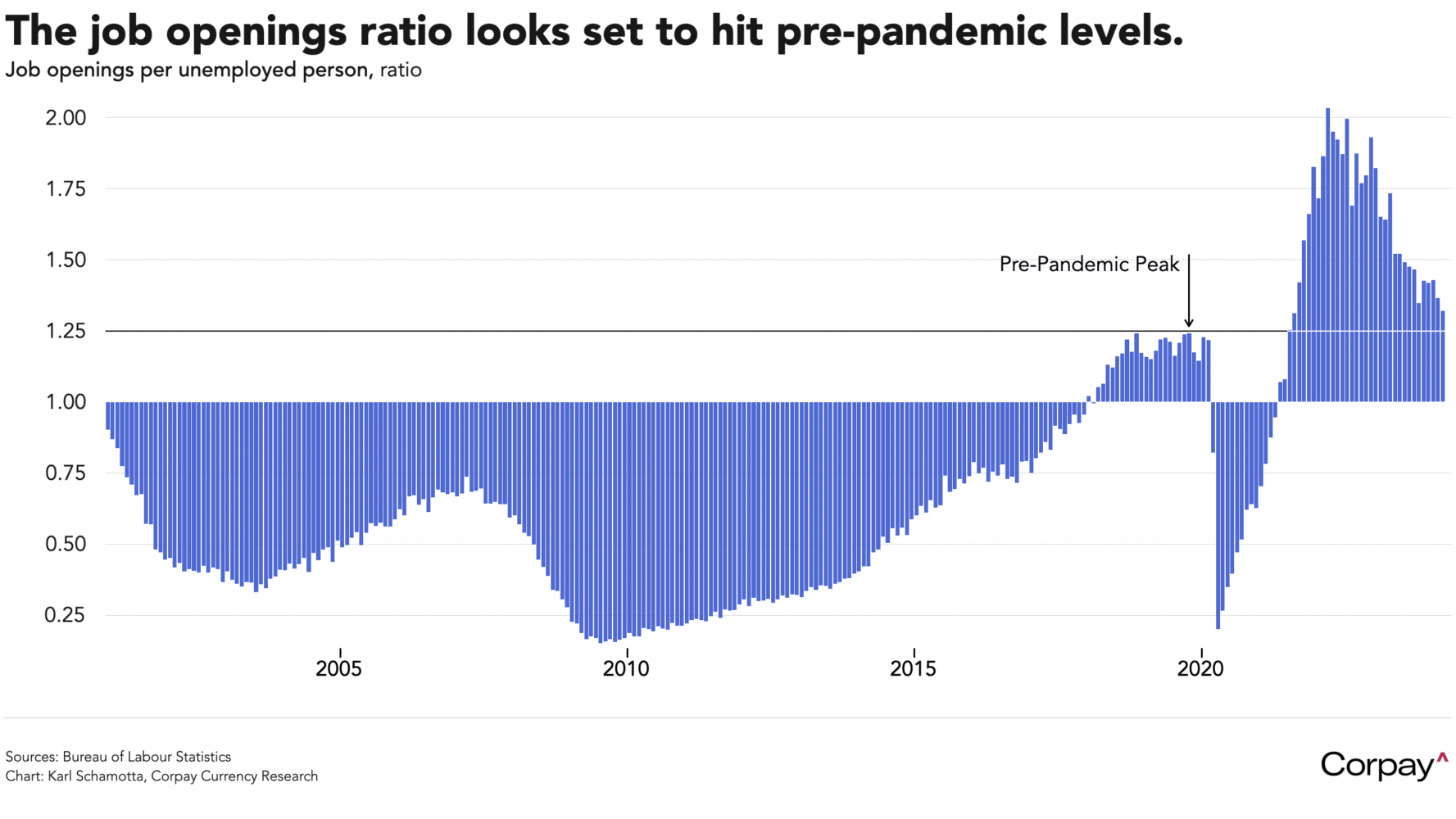Further confirmation of a coming consumer slowdown could be provided later this morning when data from the latest Job Openings and Labor Turnover Survey are released. Economists think the number of positions available dropped to roughly 8.3 million from 8.49 in the prior month, bringing the vacancy-to-unemployment ratio to within striking distance of pre-pandemic peaks. Although lags can be long and variable, softer labour market demand typically translates into weaker wage growth and a decline in consumer spending.