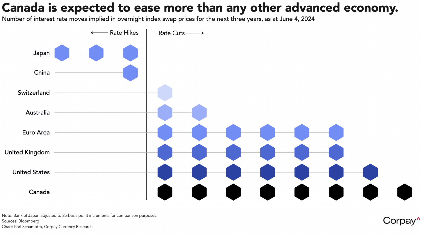 The Canadian dollar is well-ensconced near the bottom of its trading range as traders ride market momentum into tomorrow’s Bank of Canada announcement. Markets are well prepared for a rate cut at one of the Bank’s next two meetings, and longer-term expectations for moves are the lowest among advanced economies. With Canada’s long over-dependence on debt-fuelled growth leaving the household sector incredibly vulnerable to higher borrowing costs, policymakers are seen easing rates eight times over the next three years – outpacing the US, and coming from a lower starting point. This outlook is likely to keep short interest in the currency elevated for now, but we would warn that market participants would do well to watch developments in the US fairly closely – the greenback looks priced for perfection, and a summer correction is possible if the American economy shows signs of converging with Canada’s.