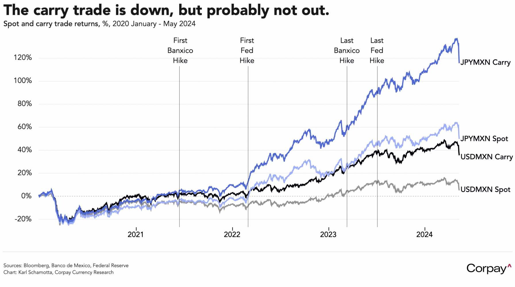 We nonetheless suspect modest gains are in the offing in the days ahead as the shock wears off and the peso’s still-attractive volatility-adjusted carry profile brings in buyers. Although the new president will clearly seek to establish policy continuity with the outgoing Andrés Manuel López Obrador administration, there are signs of a return to a more disciplined approach in the months ahead as the election is put in the rear-view mirror: as Sheinbaum put it shortly after achieving victory, she plans to maintain “austerity, financial and fiscal discipline and autonomy,” ensuring that Mexico “will never have an authoritarian or oppressive government”. “We will maintain the required division between the economic power and the political power,” she said – “We will always defend and we will work for the ultimate interest of the people of Mexico and of the nation”.