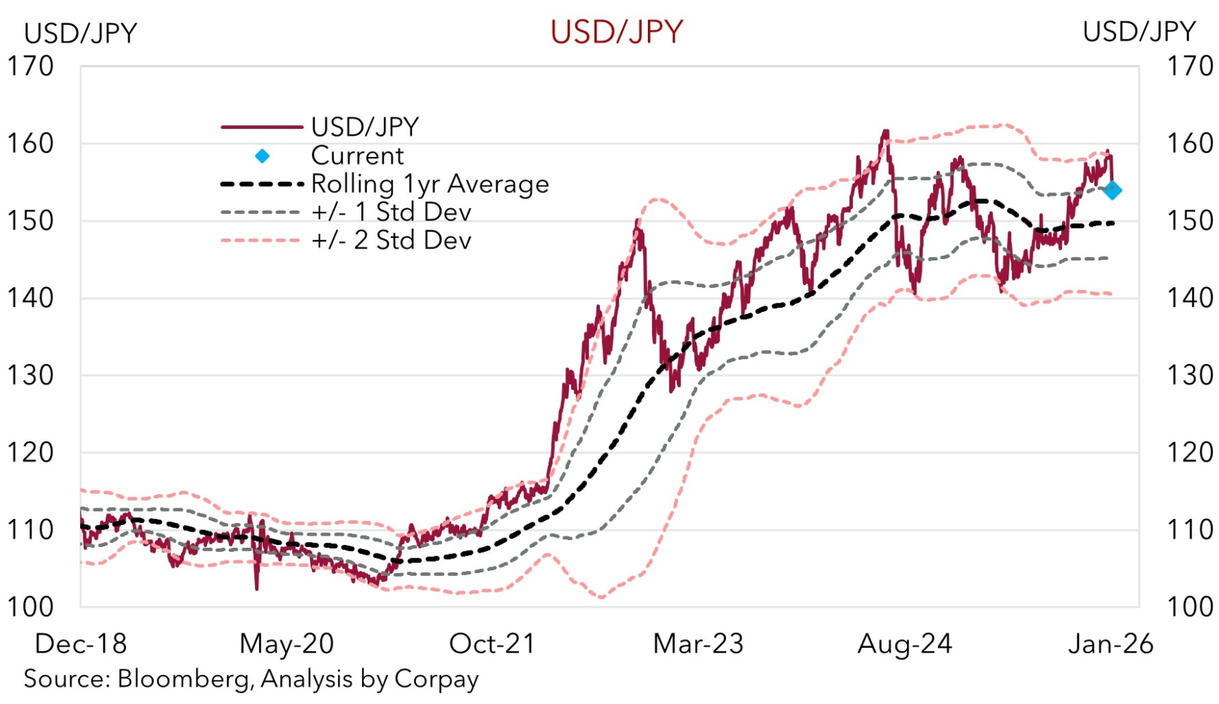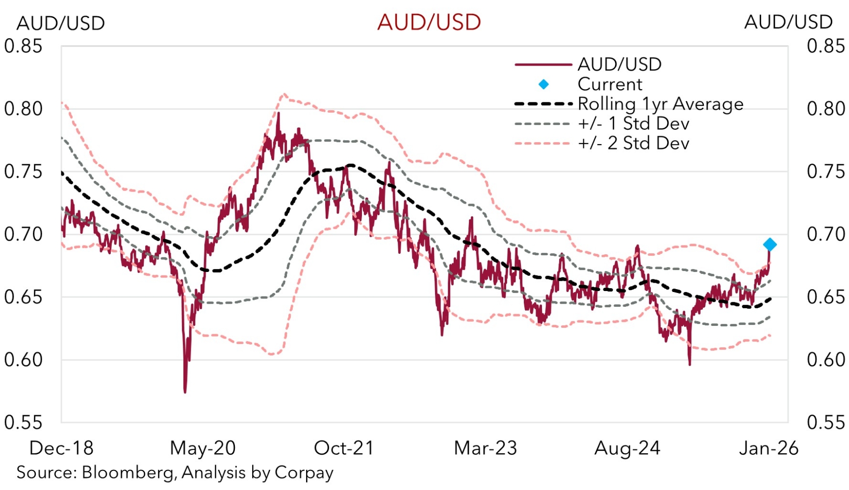 The AUD (now ~$0.6919), which has enjoyed a strong start to the year (+3.6% so far in January), is hovering around the top of the range it has traded in since Q1 2023. The AUD paused for breath overnight on a few major crosses; however, this follows a strong run. More specifically, AUD/EUR (now ~0.5823) is tracking at levels it was last at ahead of last-April’s ‘Liberation Day’ tariff announcements. AUD/CNH (now ~4.8082) is up around the top of the range it has occupied since October 2024, and AUD/GBP (now ~0.5057) is closing in on its 1-year peak. AUD/JPY (now ~106.62) has fallen back over the past few days (-2.2% since Friday) due to the JPY’s broad-based recovery. We had been flagging that there were uneven risks for AUD/JPY at such elevated levels (i.e. a greater chance of a decline than further rise). We think AUD/JPY still looks stretched compared to underlying drivers and that over the medium-term it should fall further (to ~101 later this year).
