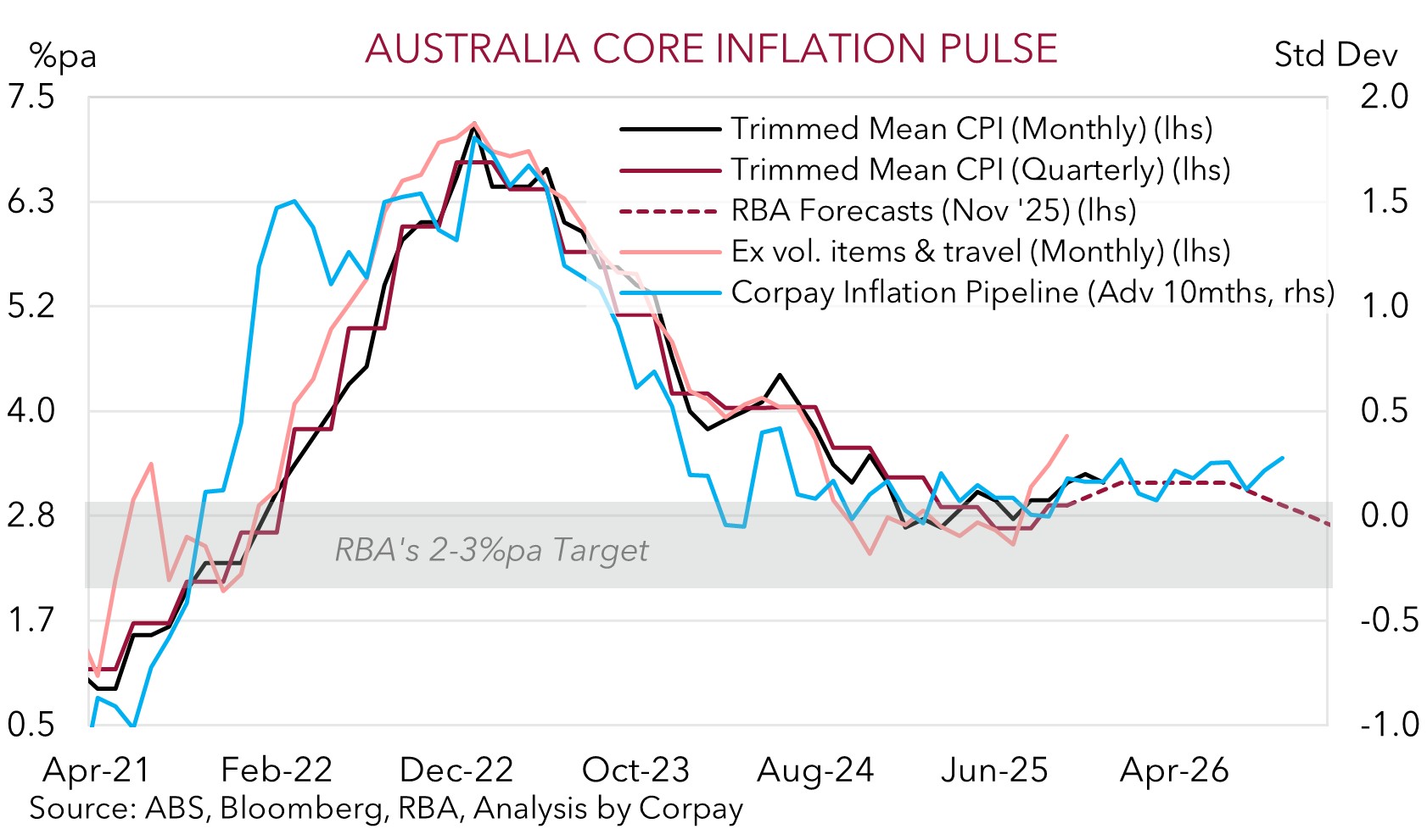 Today in Australia focus will be on Q4 CPI (11:30am AEDT). With the economy still operating at a high level (as shown by above average capacity utilization and low unemployment) inflation is proving to be a hard nut to crack. Indeed, base-effects related to the unwind of government electricity subsidies and other factors point to headline inflation accelerating (mkt 3.6%pa). For the RBA, more attention will be on the underlying/core inflation pulse. Markets are forecasting core inflation to be a little higher than the RBA is anticipating (trimmed mean: mkt 0.9%qoq/3.3%pa, RBA 0.8%qoq/3.2%pa). We would note that there has been a tendency for Q4 core inflation to slightly undershoot consensus predictions over the past few years. With this in mind, and based on the AUD’s rapid appreciation recently (the AUD has reached ‘overbought’ levels on short-term technical/momentum indicators) we feel the data might not be strong enough to see the AUD kick on even further near-term. Rather we see a risk the AUD dips a bit short-term in a “buy the rumor, sell the fact” type scenario, particularly as we also think the beaten-up USD may recoup some lost ground on the back of the US Fed meeting (Thurs 6am AEDT). That said, this should only be viewed as a “temporary reprieve” with underlying medium-term trends becoming more AUD supportive, in our opinion.