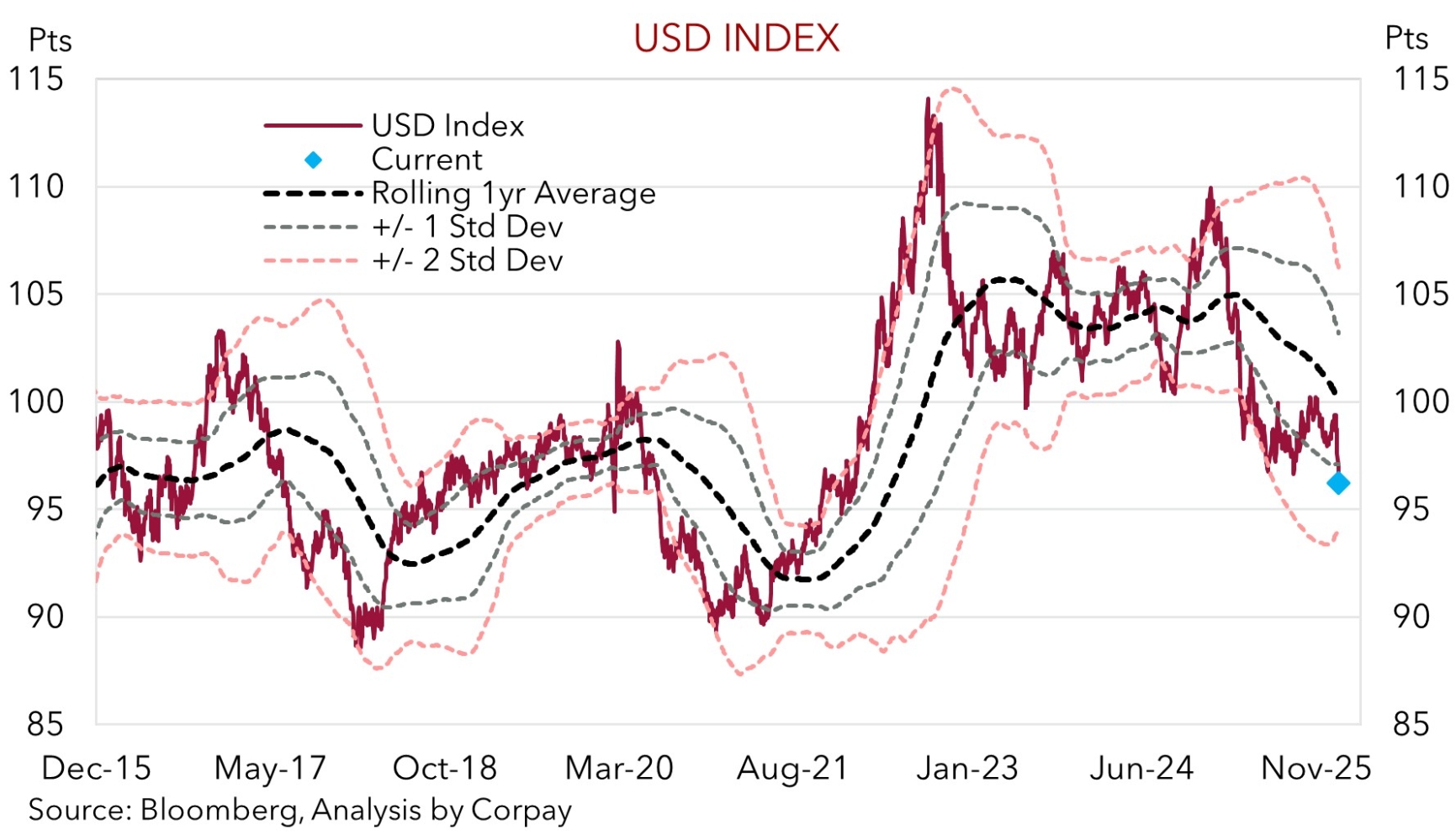 Looking ahead, the Bank of Canada looks set to hold interest rates steady tonight (1:45am AEDT), so should the US Federal Reserve (Thurs 6am AEDT). The Fed isn’t updating its economic forecasts this time around. With US unemployment still low, activity holding up, and fiscal settings more supportive through H1 2026, we believe Fed Chair Powell may reiterate policy is “well positioned”, suggesting there isn’t a great deal of urgency to cut interest rates again near-term. In our view, this might give the beleaguered USD a bit of temporary support.