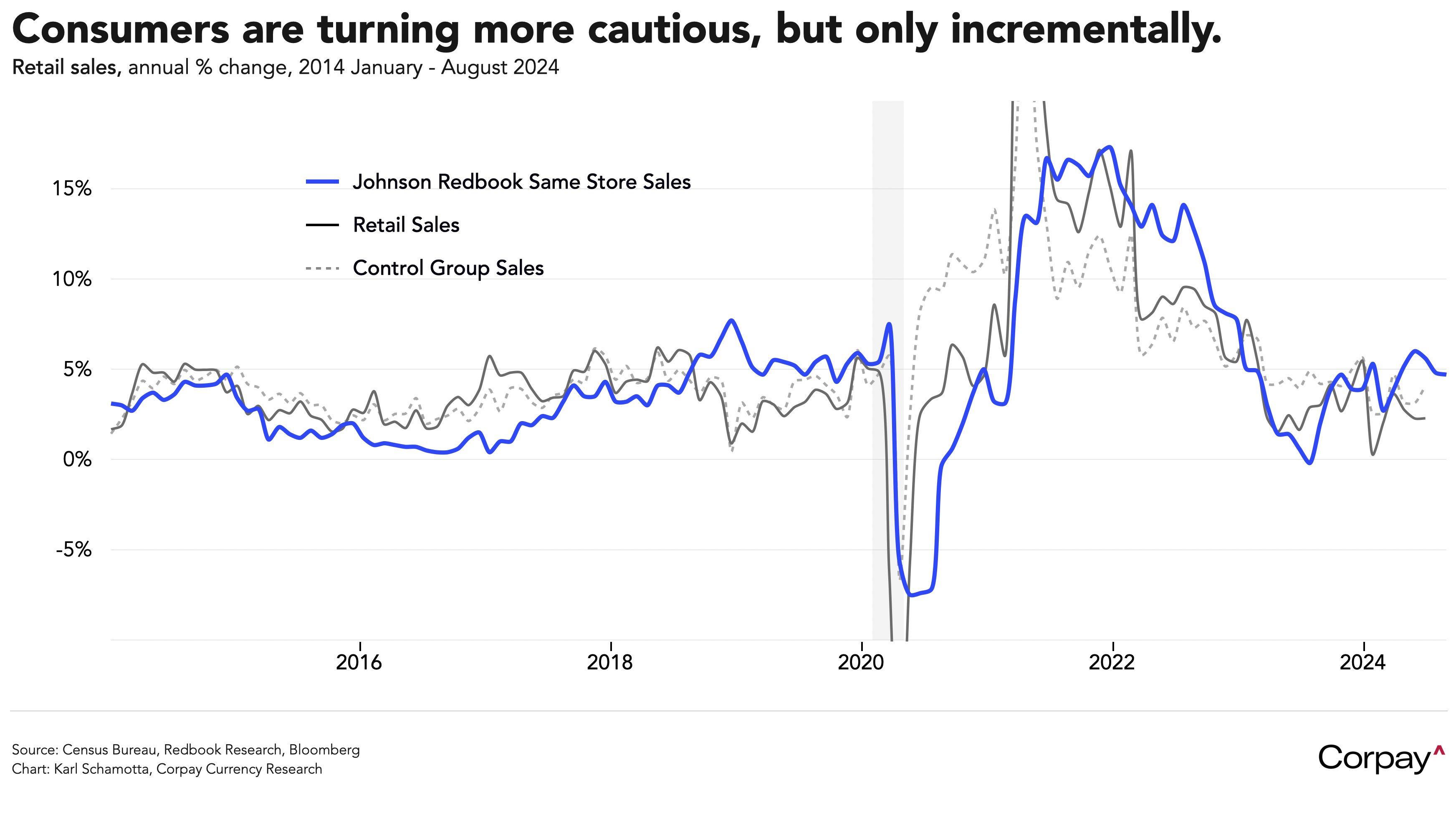 The British pound is holding firm after the economy maintained its growth trajectory in the second quarter, supporting the case for a cautious approach to easing monetary policy from the Bank of England. According to the Office for National Statistics, gross domestic product grew at an annualised 2.3-percent pace in the three months ended June, with a slight deceleration toward the end of the quarter likely coming from election-related uncertainty (and a lack of Taylor Swift concerts) – suggesting that the handoff to the second half remained strong. Traders are pricing two rate cuts before year end, but we see risks biased toward a more gradual trajectory, with the pound exposed to upside gains if policymakers prove more timid than currently expected.